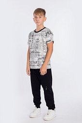 Костюм для мальчика выполнен из кулирки, состоит из футболки и шорт. Футболка с круглым вырезом горловины и принтом спереди. Шорты с поясом на резинке.