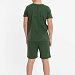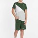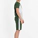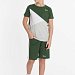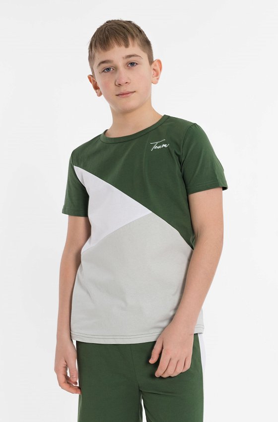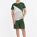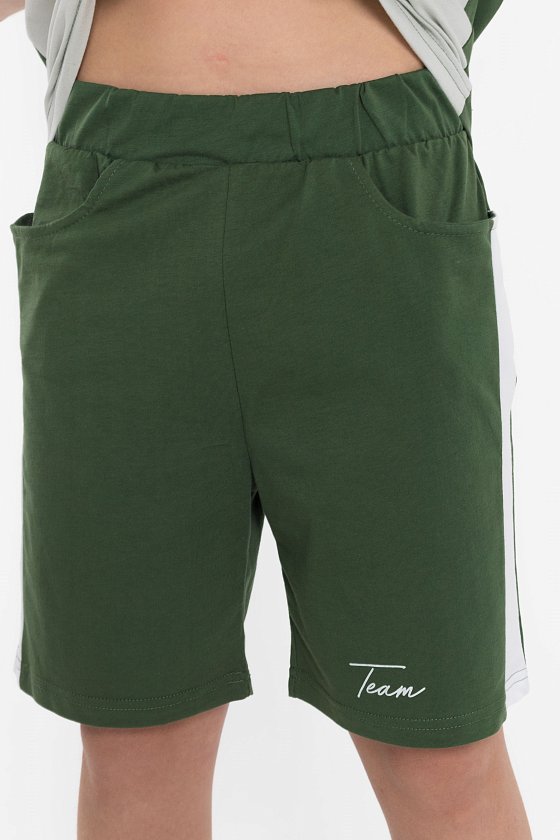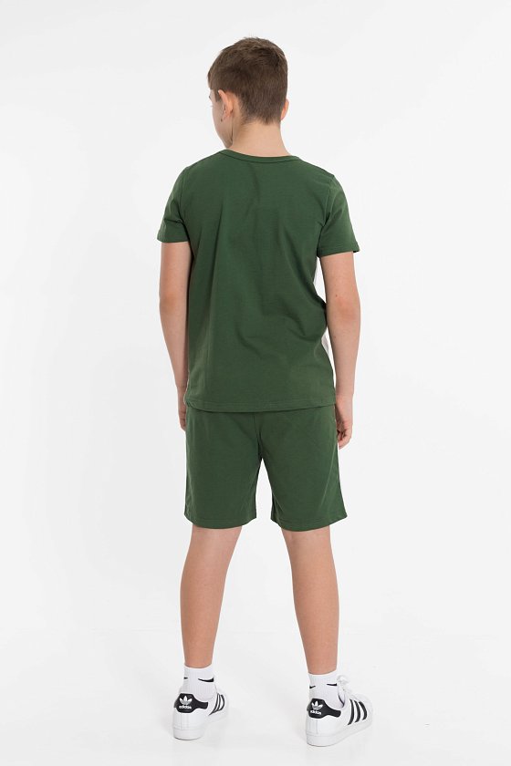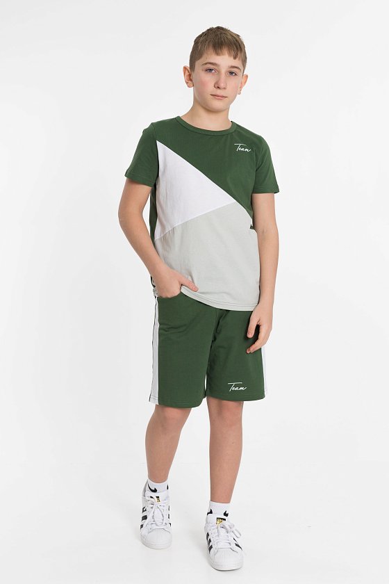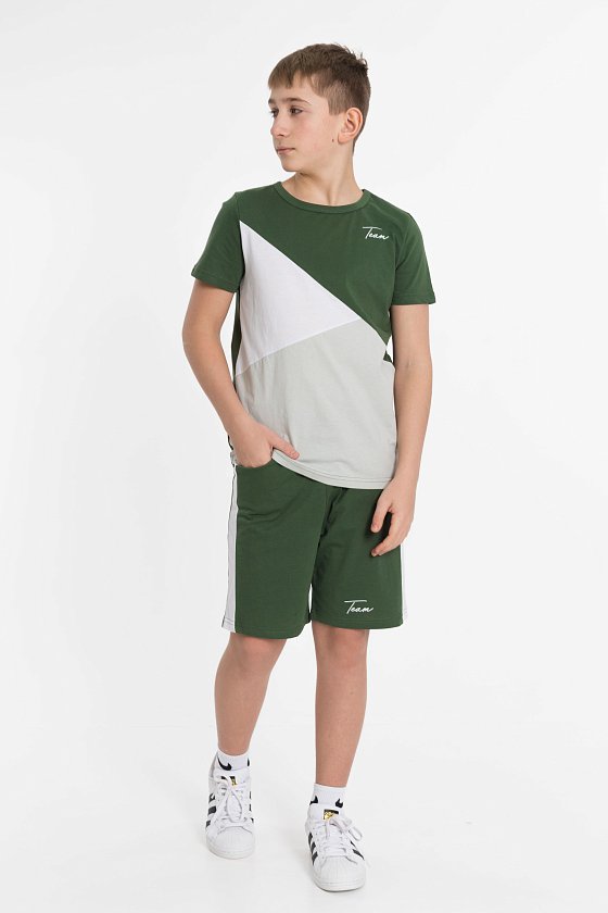 Костюм выполнен из хлопкового полотна, состоит из футболки и шорт. Футболка прямого силуэта, круглый вырез горловины оформлен бейкой, рукав короткий. С левой стороны нанесён принт. Шорты с принтом, поясом на резинке и карманами по бокам.