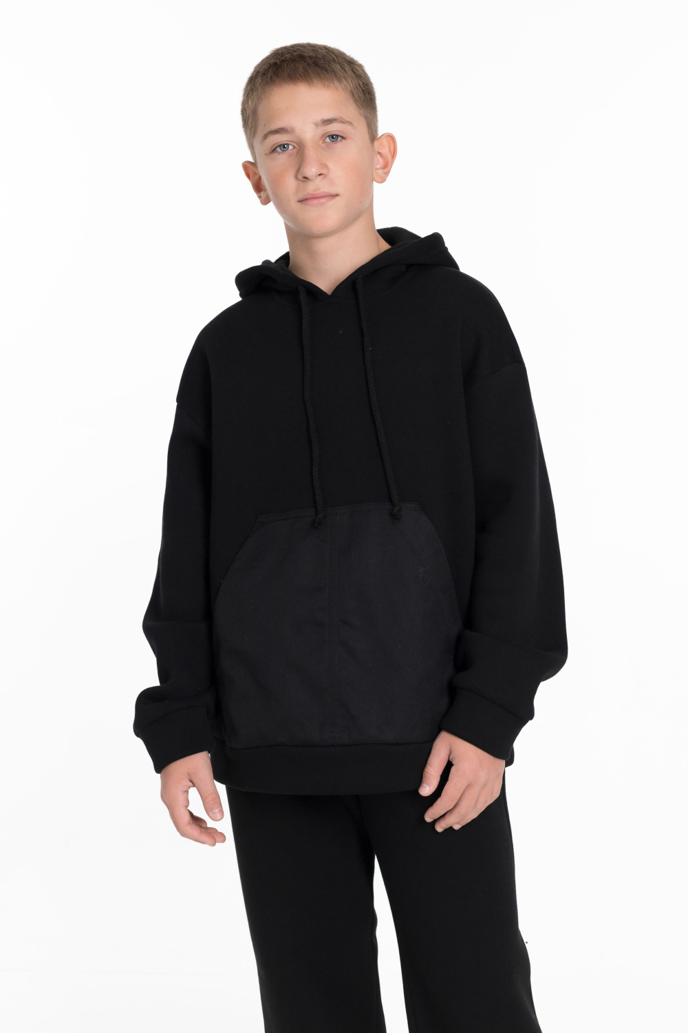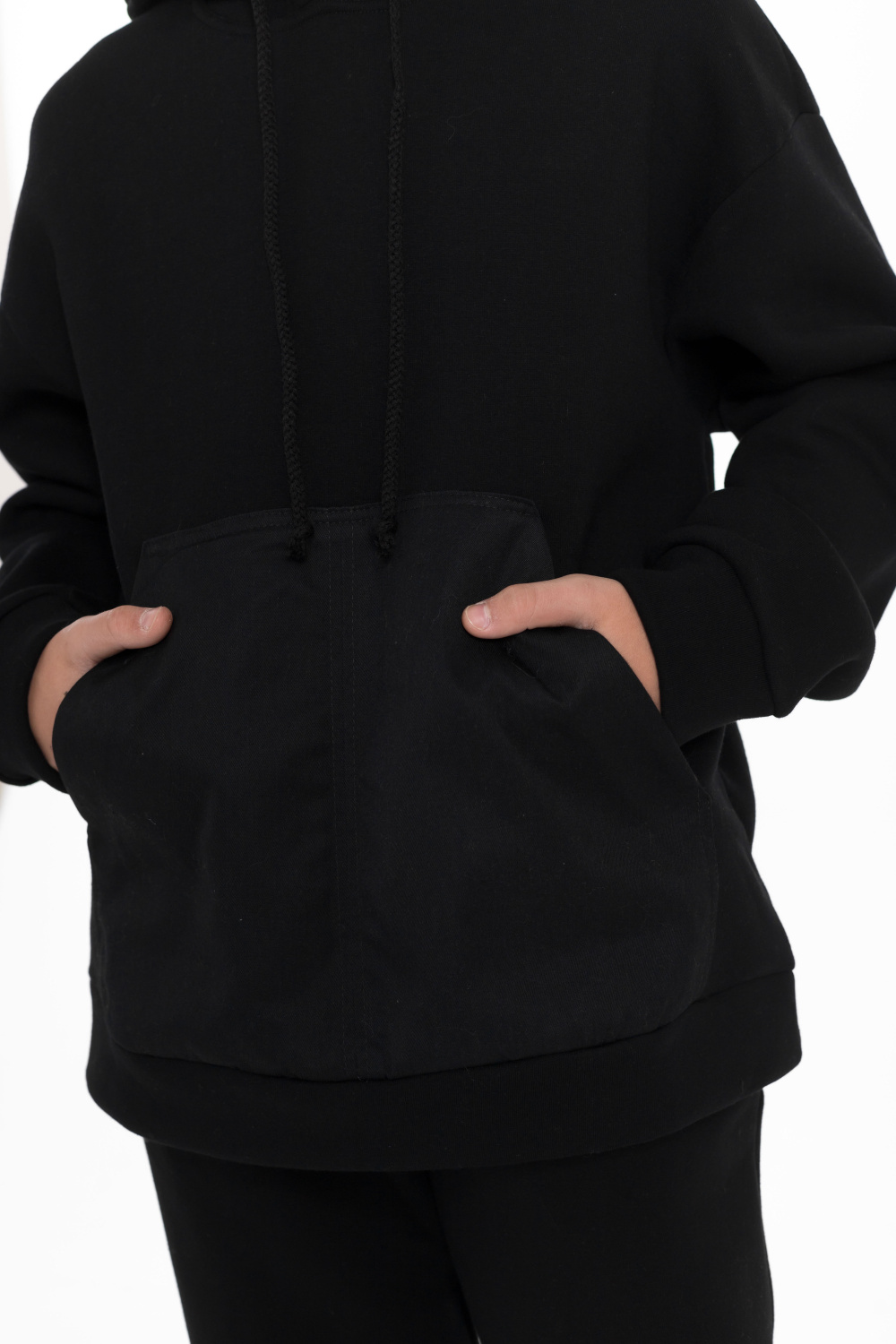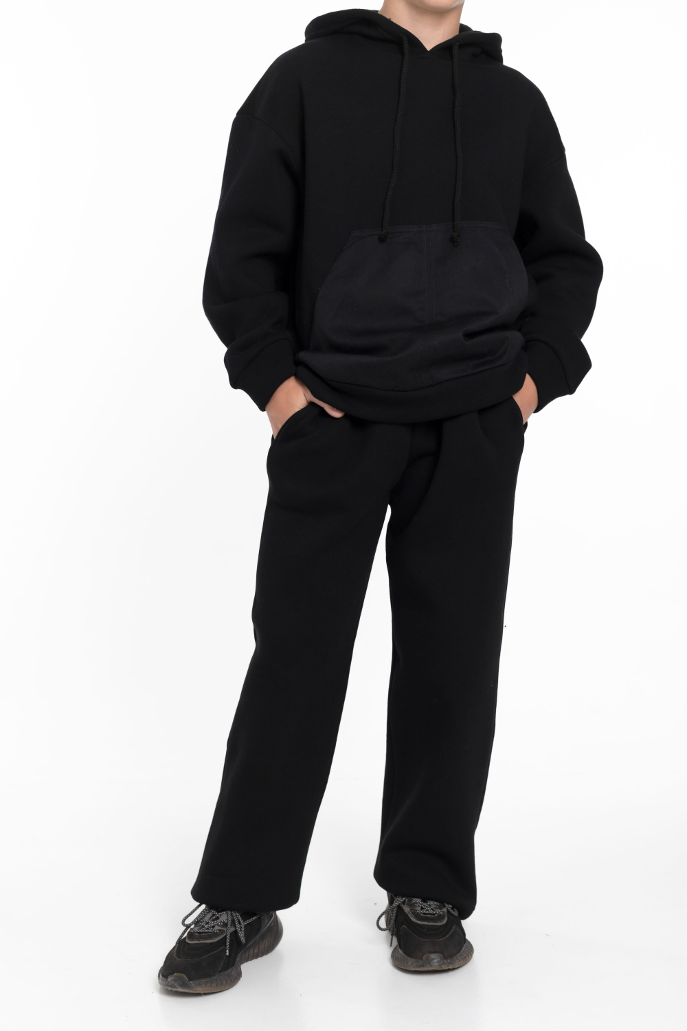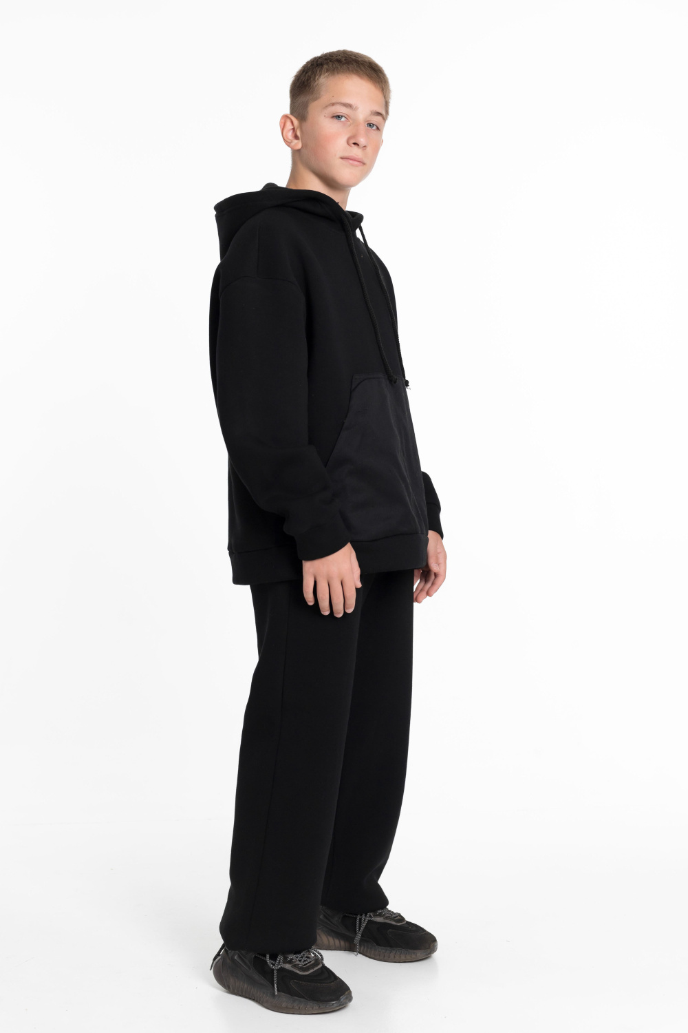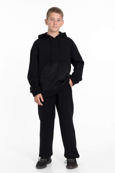 Костюм для мальчика состоит из толстовки и брюк, выполненных из высококачественного футера с начесом. Толстовка имеет спущенную линию плеча, длинные рукава и капюшон на шнуре для дополнительного комфорта. Карманы накладные спереди из саржи хлопкополиэфирной придают костюму стильный вид.