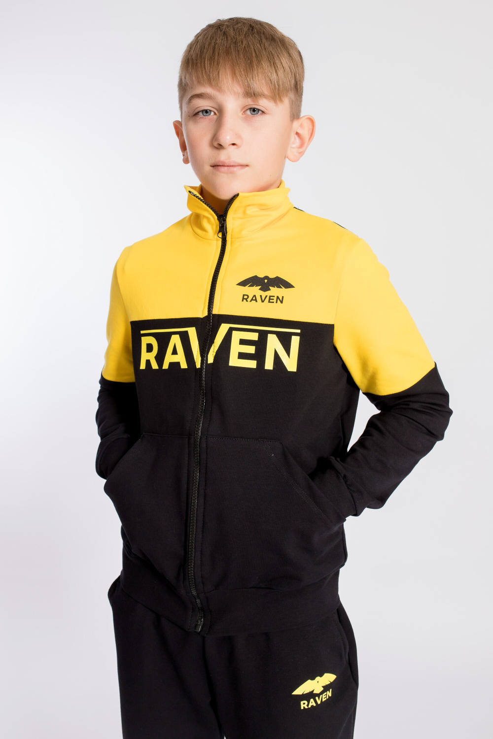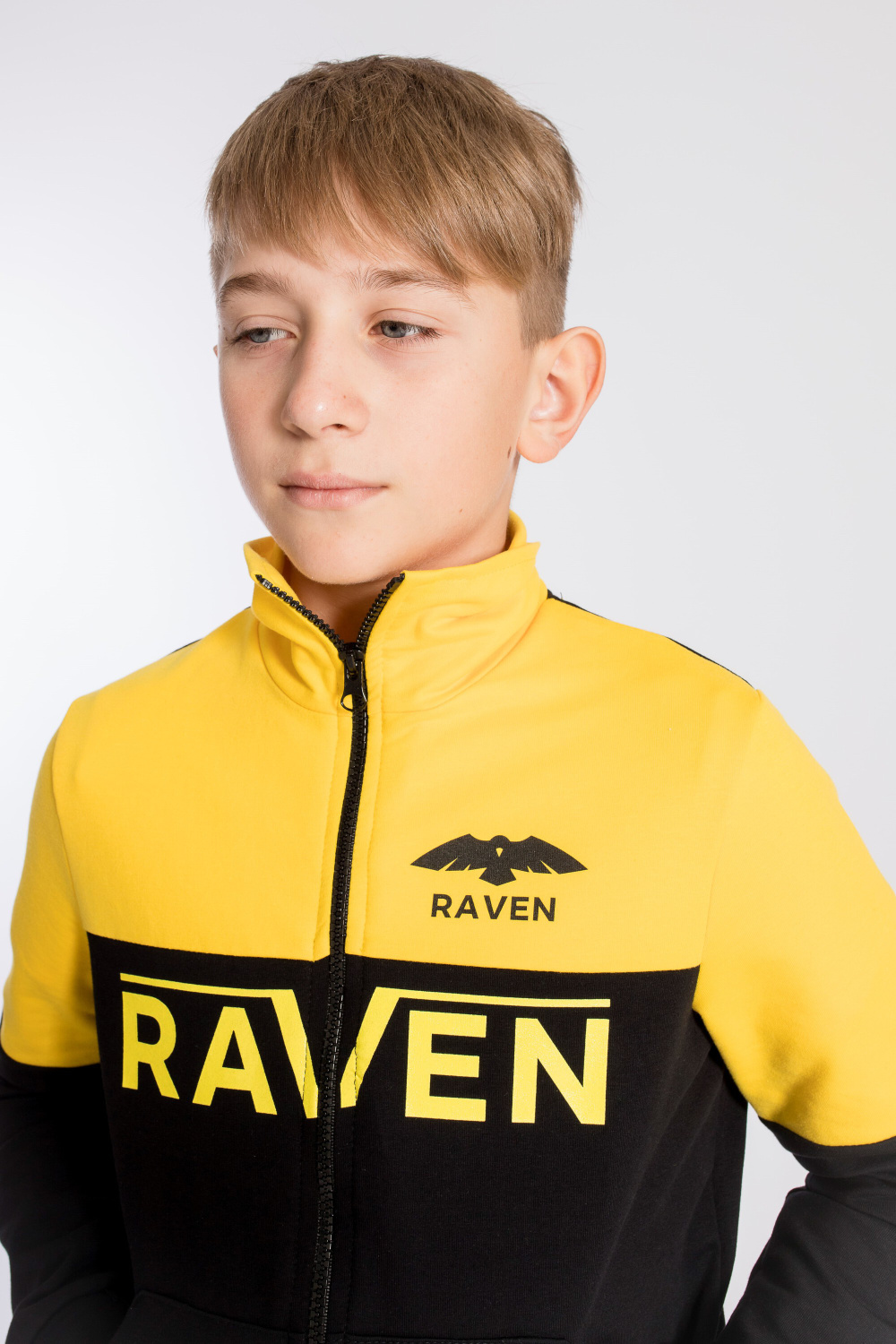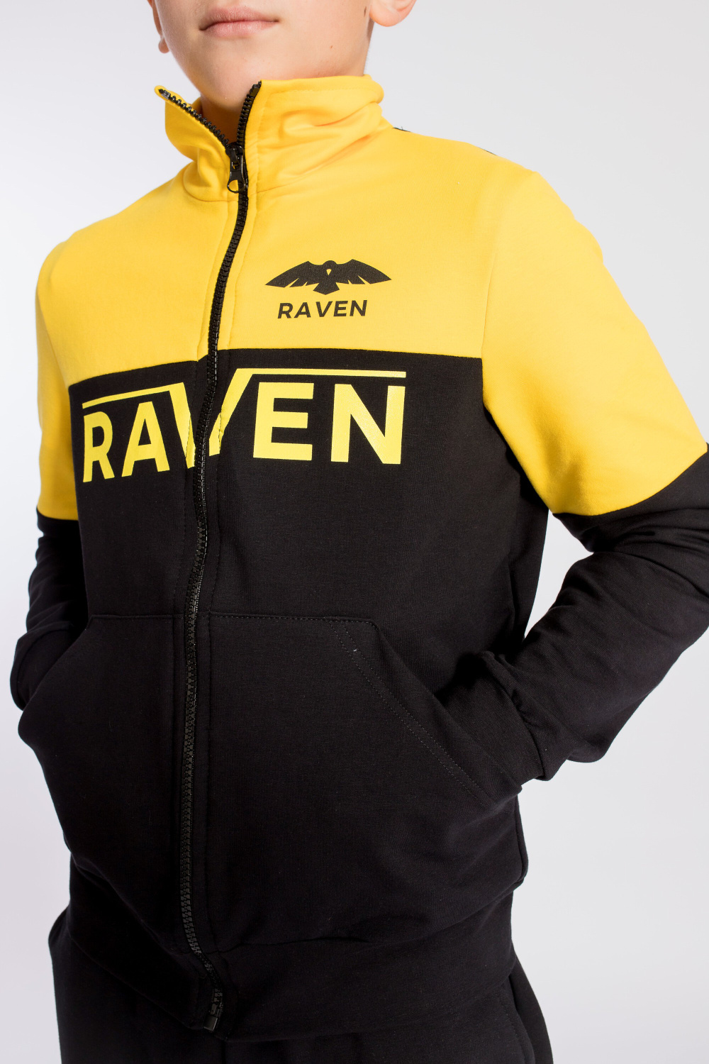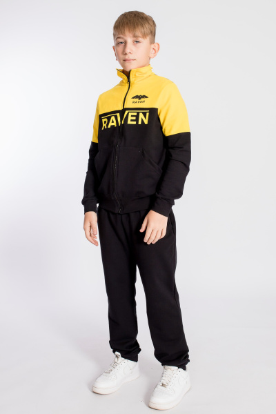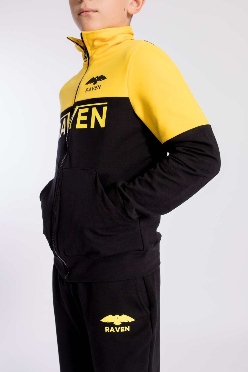 Костюм выполнен из однотонного футера с лайкрой, состоит из брюк и толстовки. Толстовка с застежкой на молнию, воротником-стойкой и карманами-кенгуру. Рукава на манжетах, кокетки переда и верхние детали рукавов из полотна отделочного цвета. На толстовке и брюках нанесён принт. Брюки с боковыми карманами, притачным поясом и манжетами.