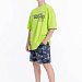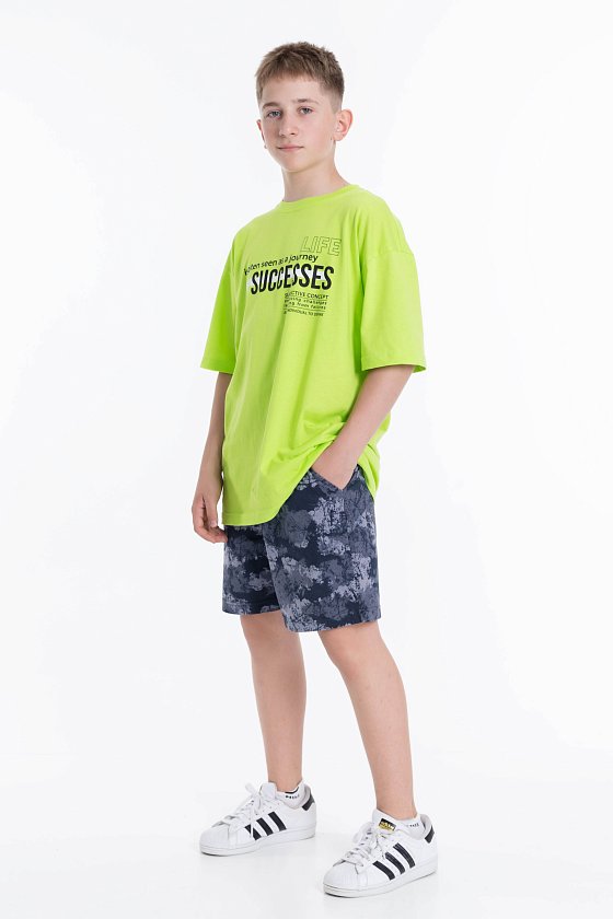 Костюм для мальчиков из 100% хлопка. Футболка свободная, однотонная, круглый вырез горловины, спущенный рукав, на полочке принт. Шорты свободные, пояс на резинке, боковые карманы.