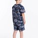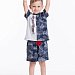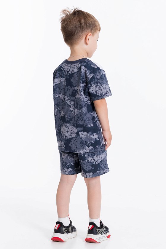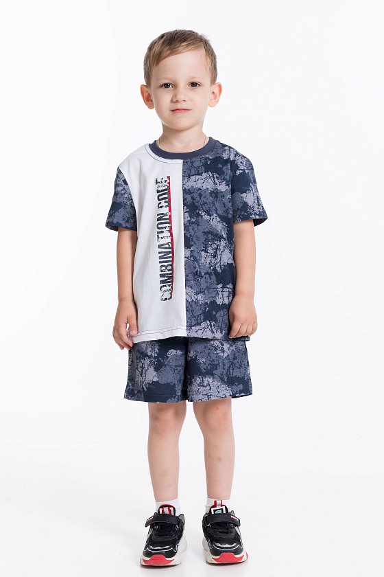 Костюм для мальчика выполнен из хлопкового полотна, состоит из футболки и шорт. Футболка с коротким рукавом и круглым вырезом горловины. Шорты средней длины, свободного кроя с поясом на резинке и шнуре. На правой полочке футболки принт.