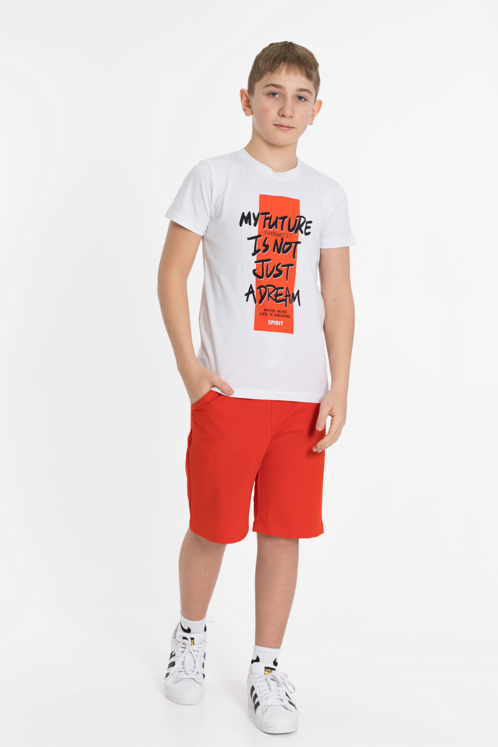 Костюм из х/б полотна с лайкрой. Футболка прямого силуэта с круглой горловиной, короткий рукав. На полочке принт.