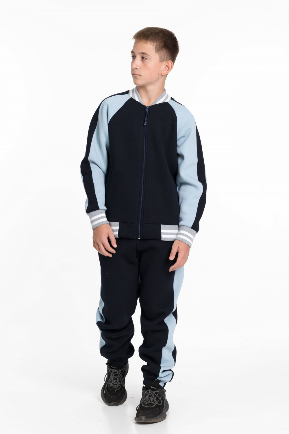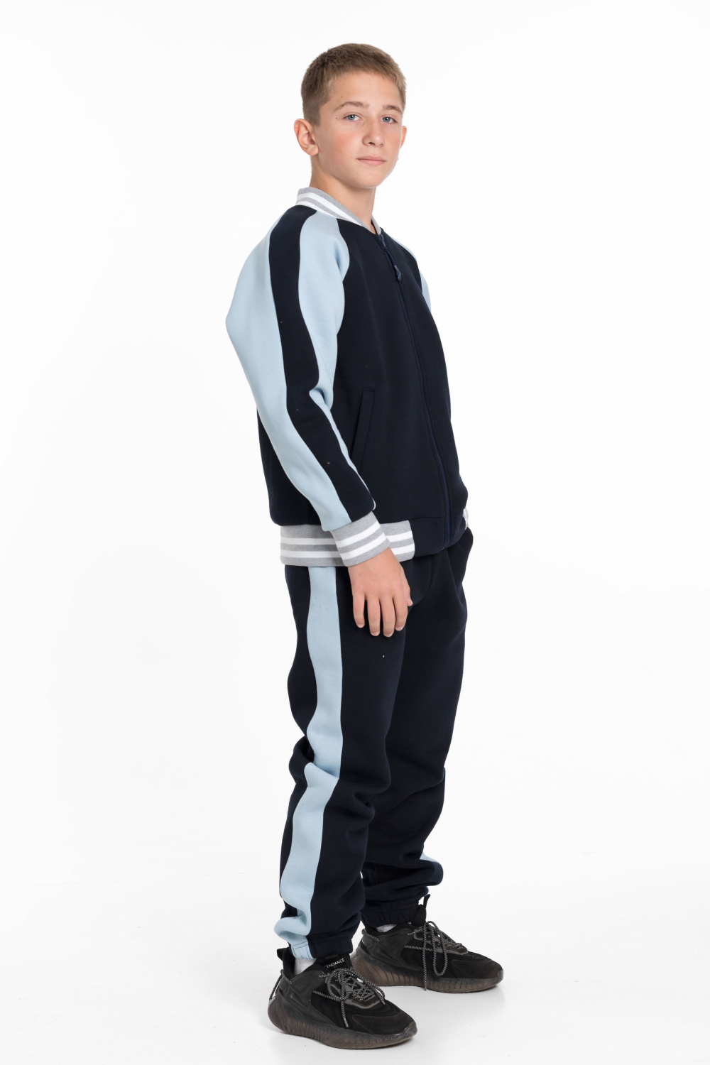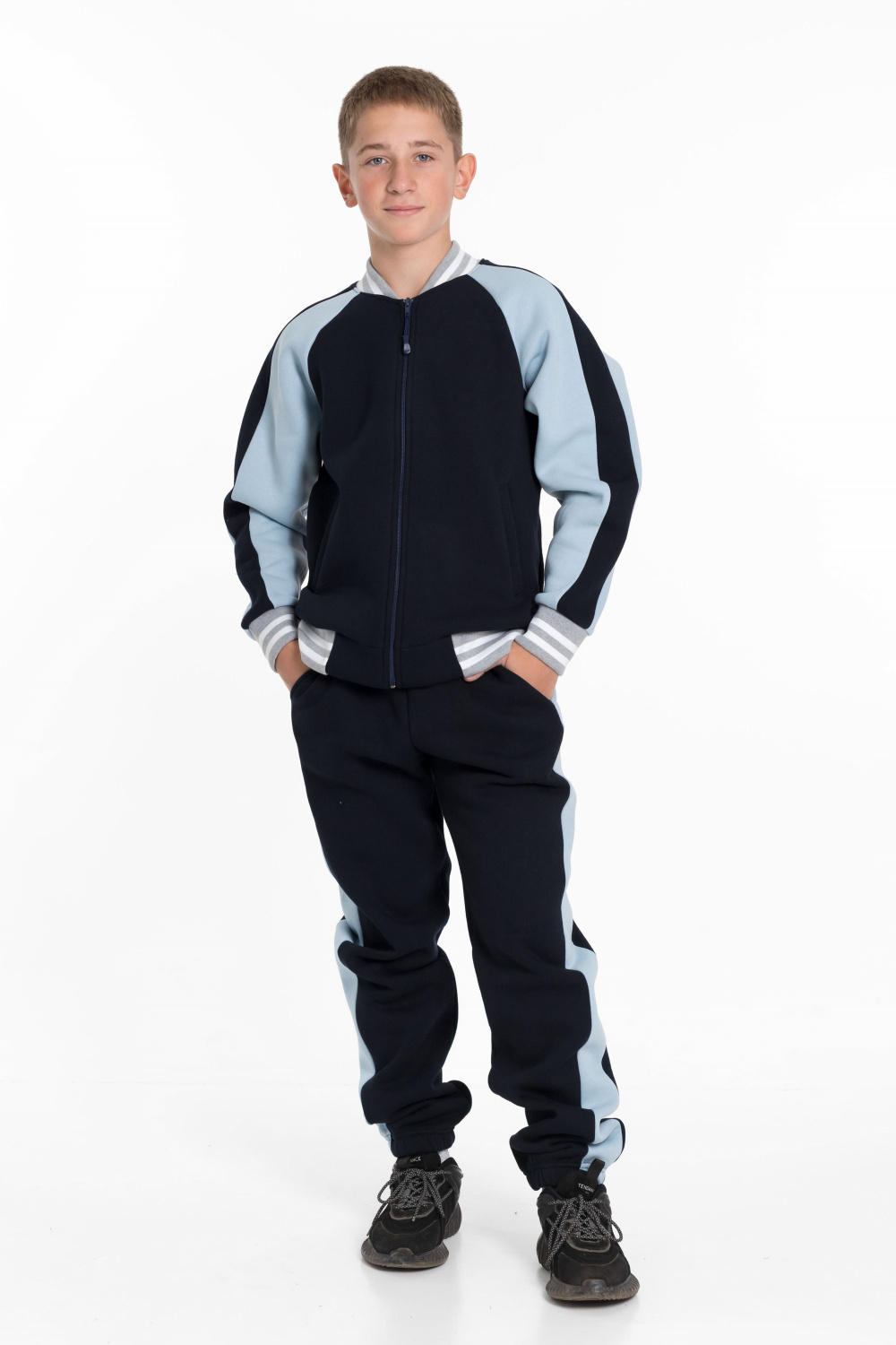 Брюки этого костюма синего цвета с лампасами серо-голубого цвета также имеют боковые карманы, пояс на резинке и шнурке для регулировки посадки, а низ на резинке обеспечивает комфорт при движении.