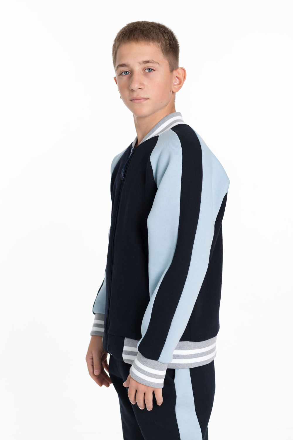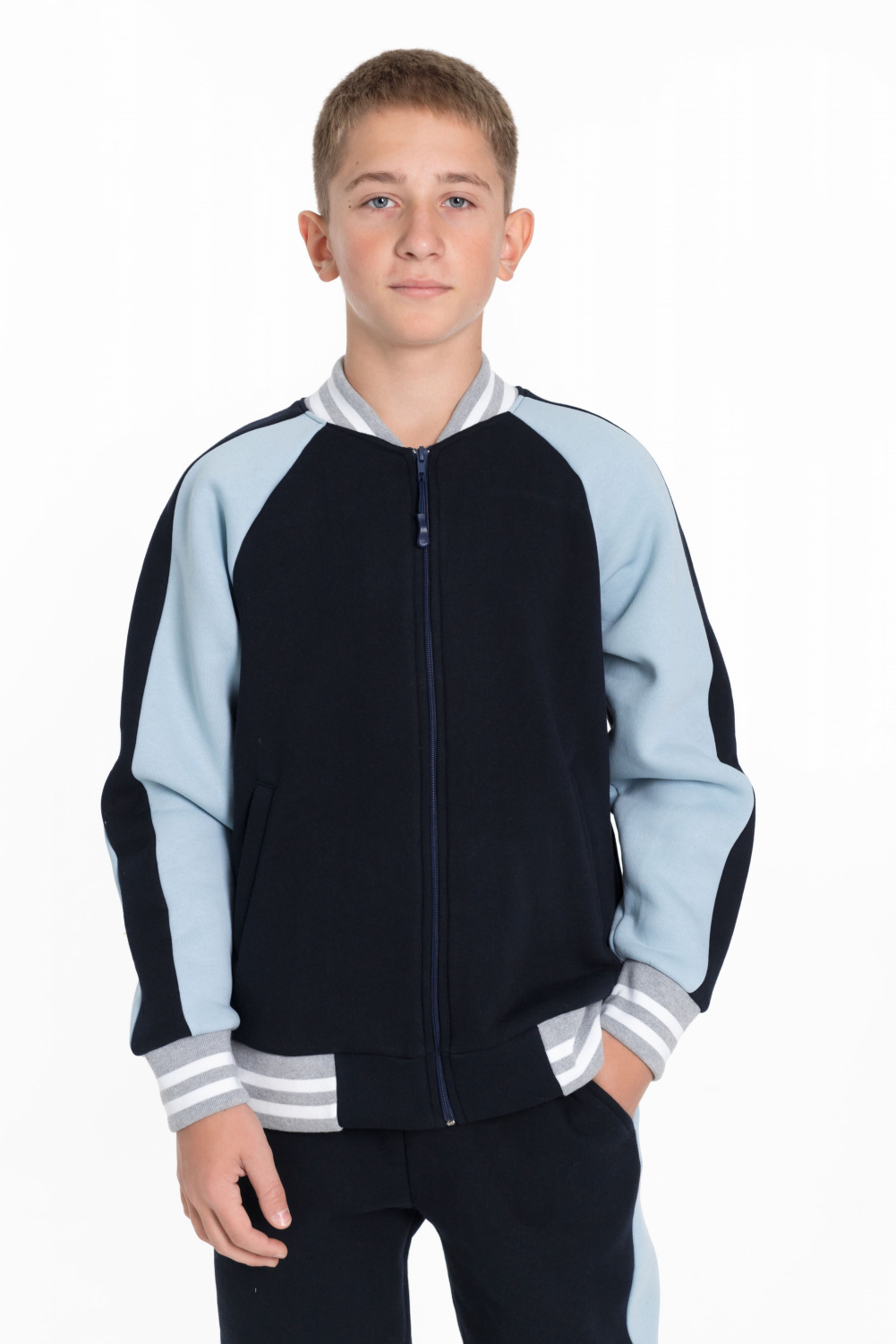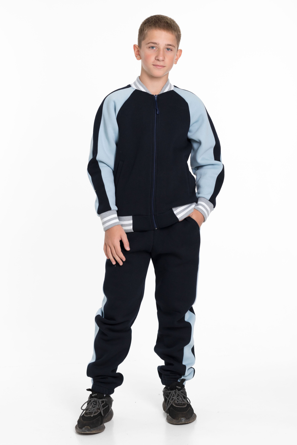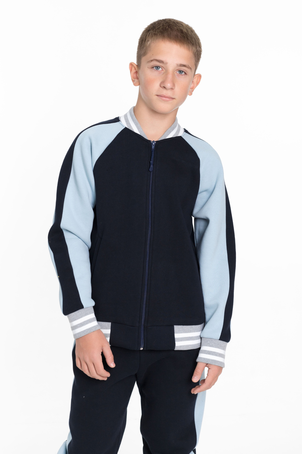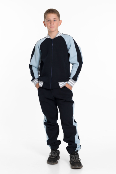 Костюм для мальчика из толстовки и брюк, выполненных из качественного футера 3-х нитки с начесом. Толстовка имеет центральную застежку на молнию, рукава-реглан серо-голубого цвета с отделкой синего цвета и боковые карманы. Воротник, манжеты рукавов и низ толстовки выполнены из кашкорсе цвета меланж с белой полосой, придавая костюму стильный и яркий вид.