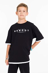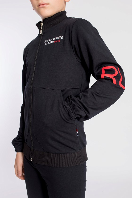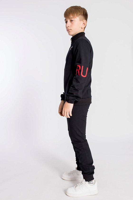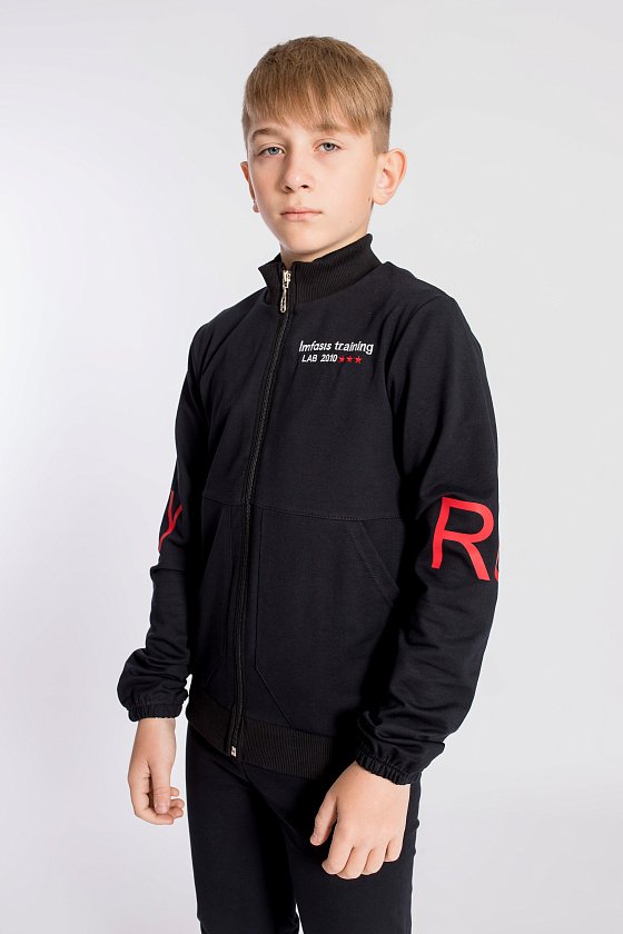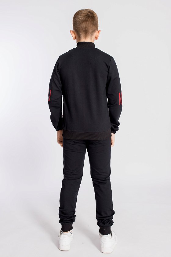Костюм детский из футер петли, куртка с центральной застежкой на молнию и воротником-стойкой. По бокам расположены карманы. Брюки с поясом на резинке и манжетами. В качестве отделки на рукавах нанесена термопечать, а спереди сделана вышивка.