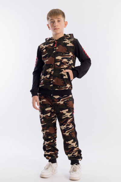 Спортивный костюм из полотна футер трёхнитка (воздушка), состоит из толстовки с застёжкой на молнии и брюк. Толстовка с капюшоном и двумя карманами спереди. Пояс брюк и толстовки, манжеты рукавов и брюк выполнены из кашкорсе. Брюки с поясом на резине и шнуре. На вставках брюк и рукавах нанесены термопринты.