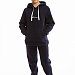 Костюм выполнен из футера с начёсом (трёхнитка), состоит из толстовки и брюк. Толстовка с капюшоном, карманом-кенгуру и принтом спереди. Пояс толстовки, низ рукавов и низ брюк оформлены манжетами из основного полотна. Пояс брюк на резине и шнуре.