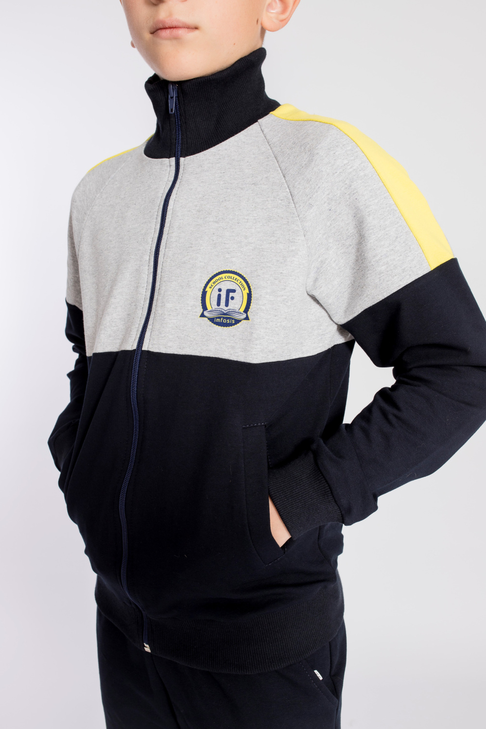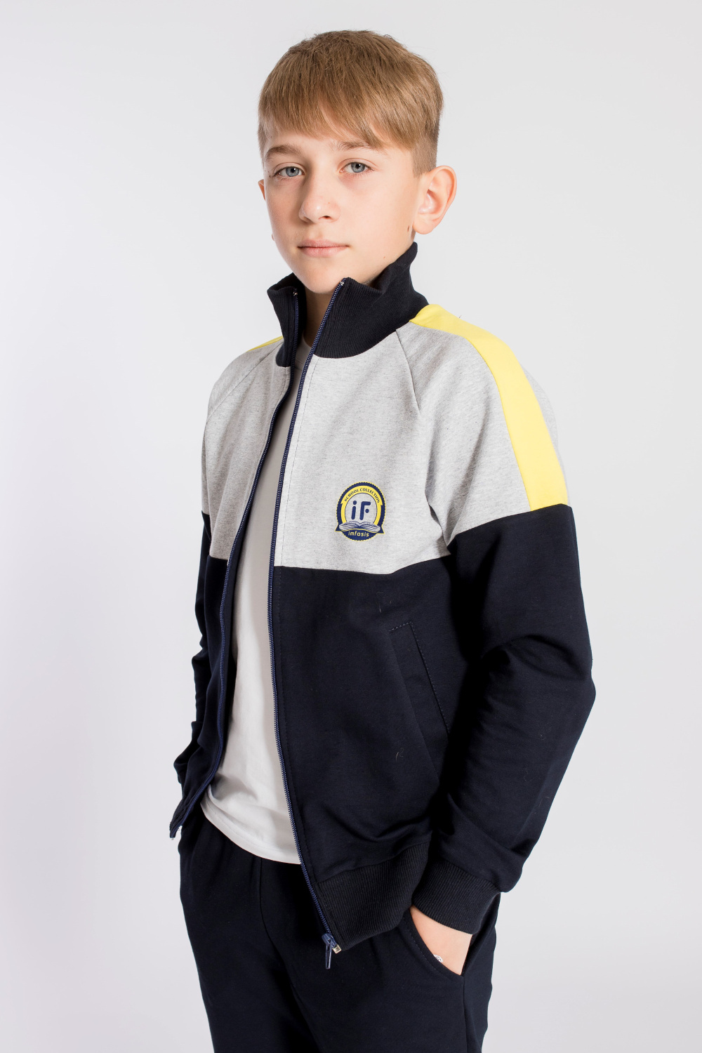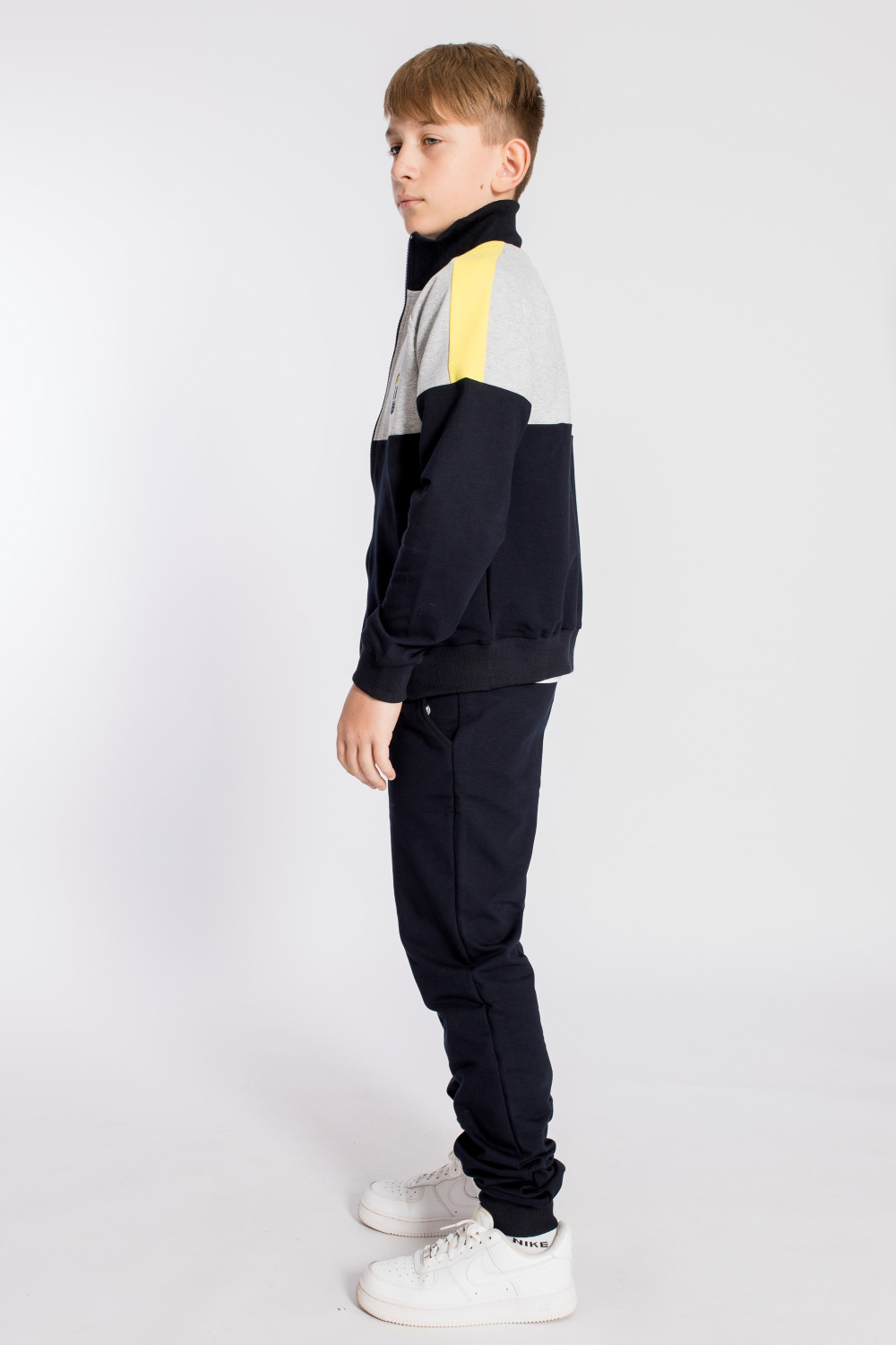 Спортивный костюм выполнен из футер петли с лайкрой. Толстовка на молнии, с рукавами покроя реглан, воротником-стойкой, манжетами и притачным поясом из кашкорсе. На толстовке и брюках есть боковые карманы и нанесён принт. Брюки с притачным поясом и манжетами, в петли пояса продернут шнур.