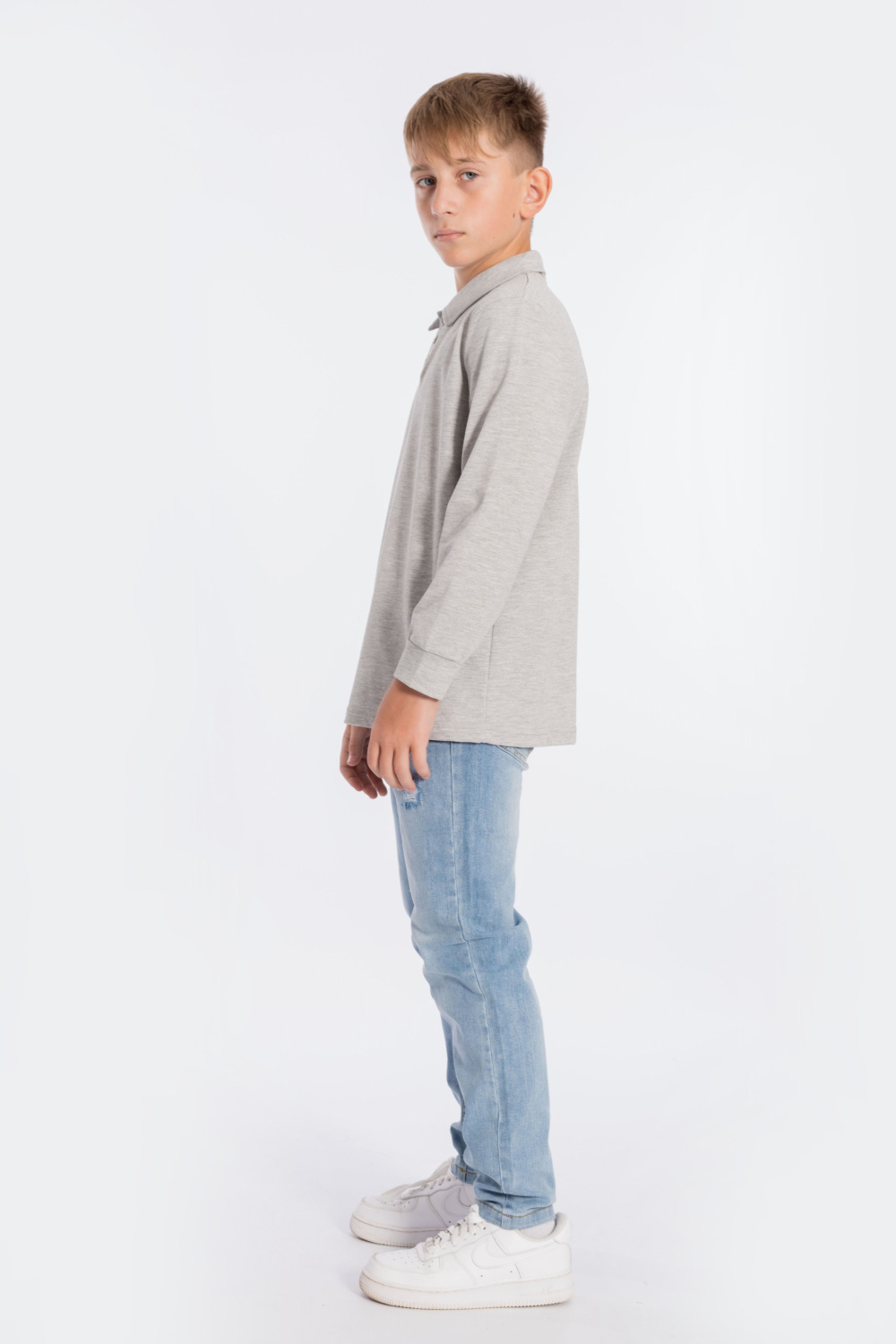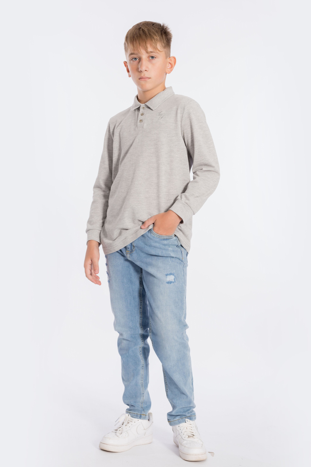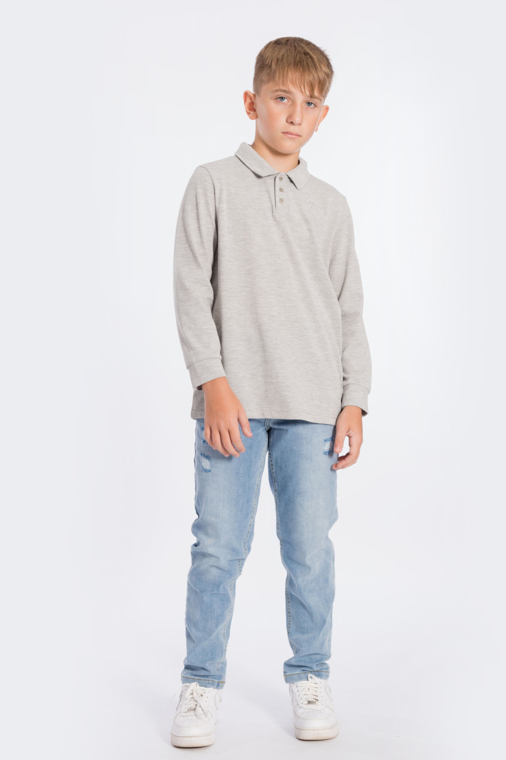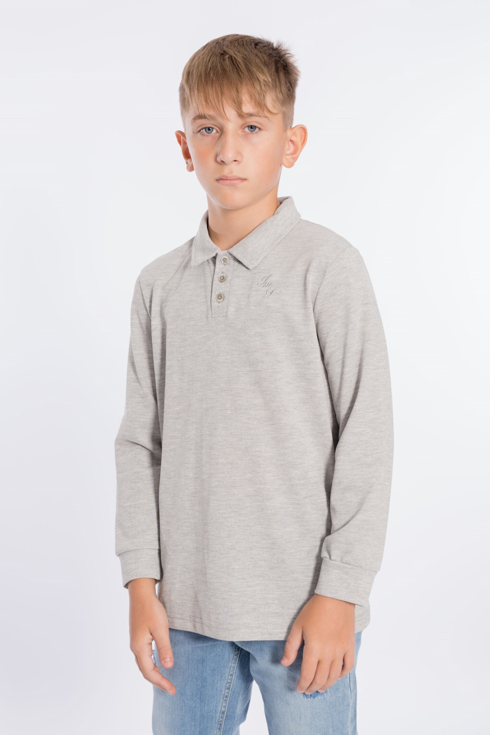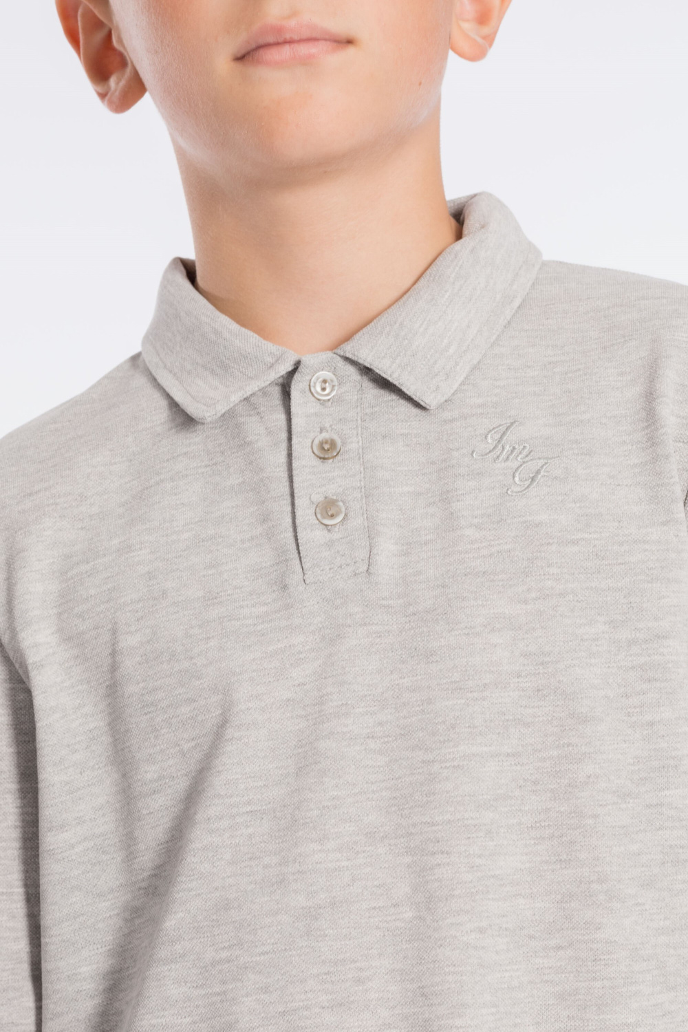 Футболка-поло с длинным рукавом из однотонного пике. Воротник с застёжкой на три пуговицы. С левой стороны размещена вышивка.