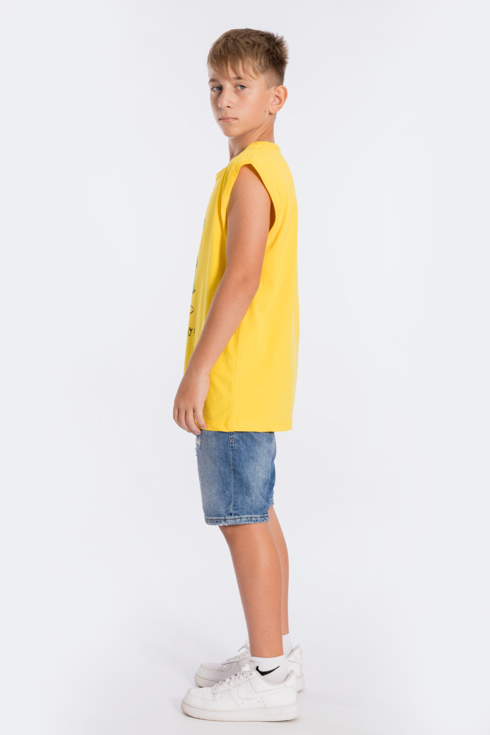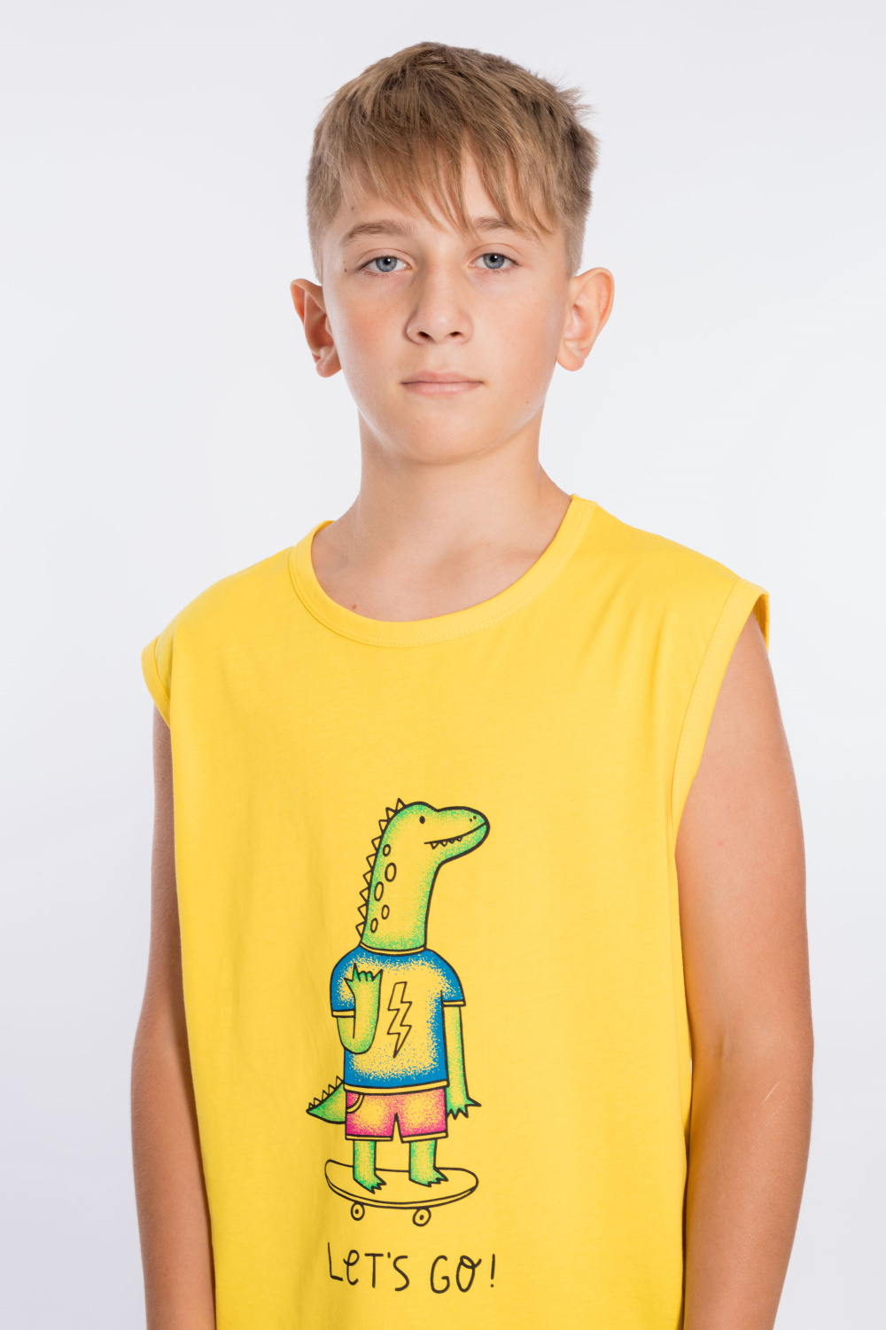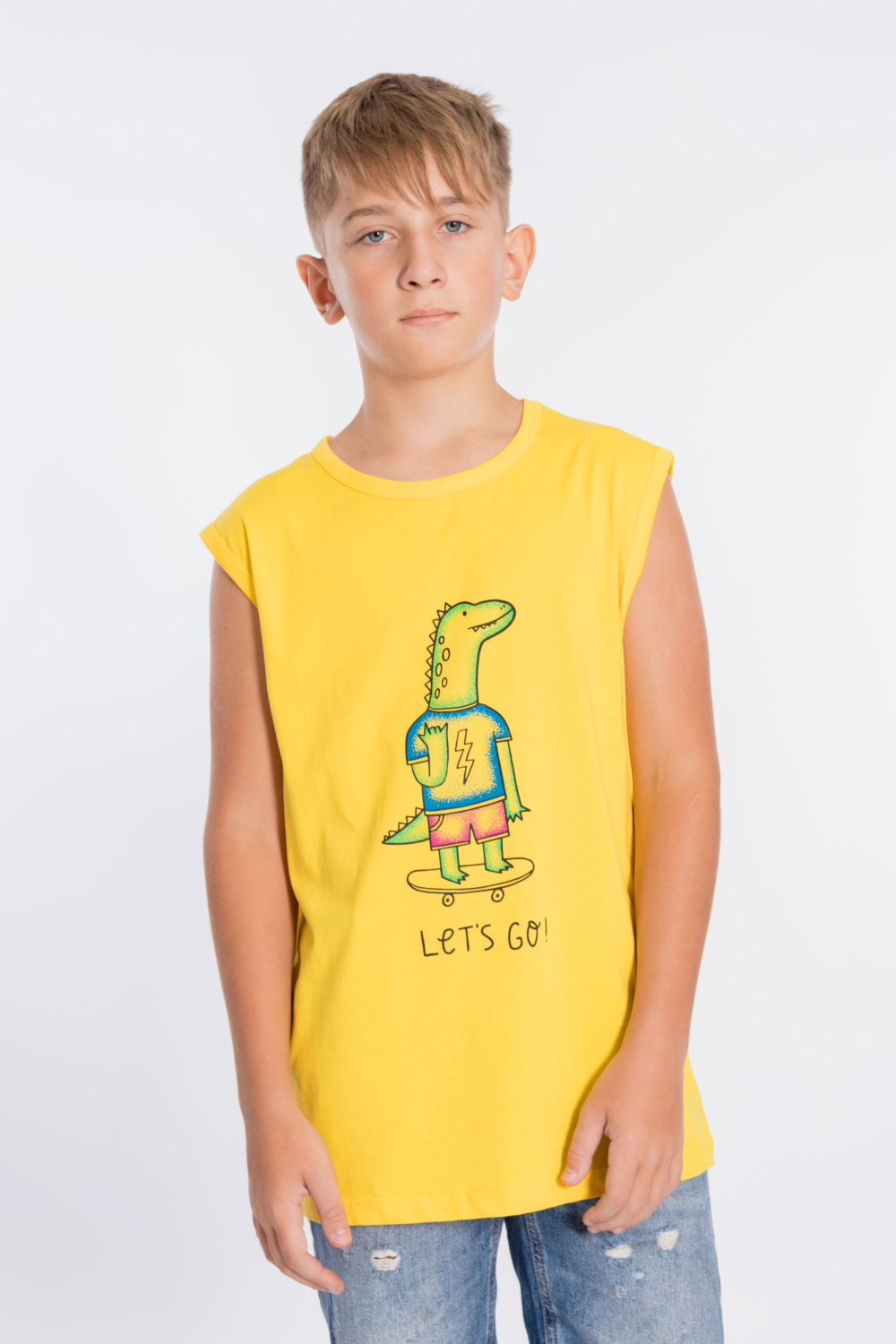 Майка из однотонной кулирки с принтом спереди.
