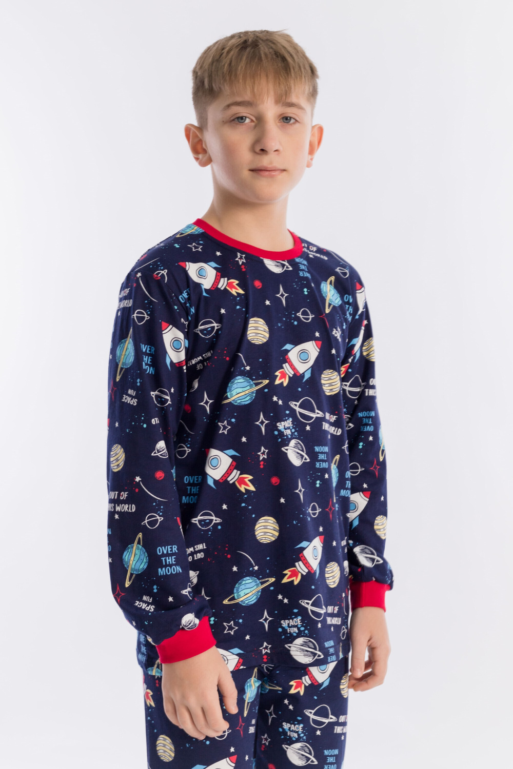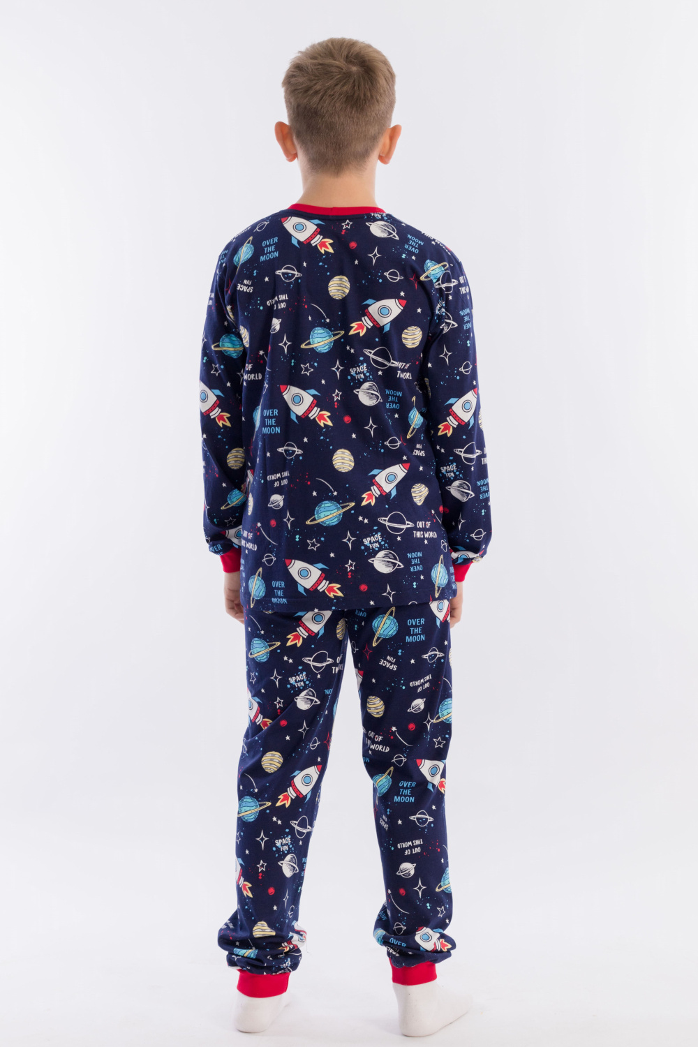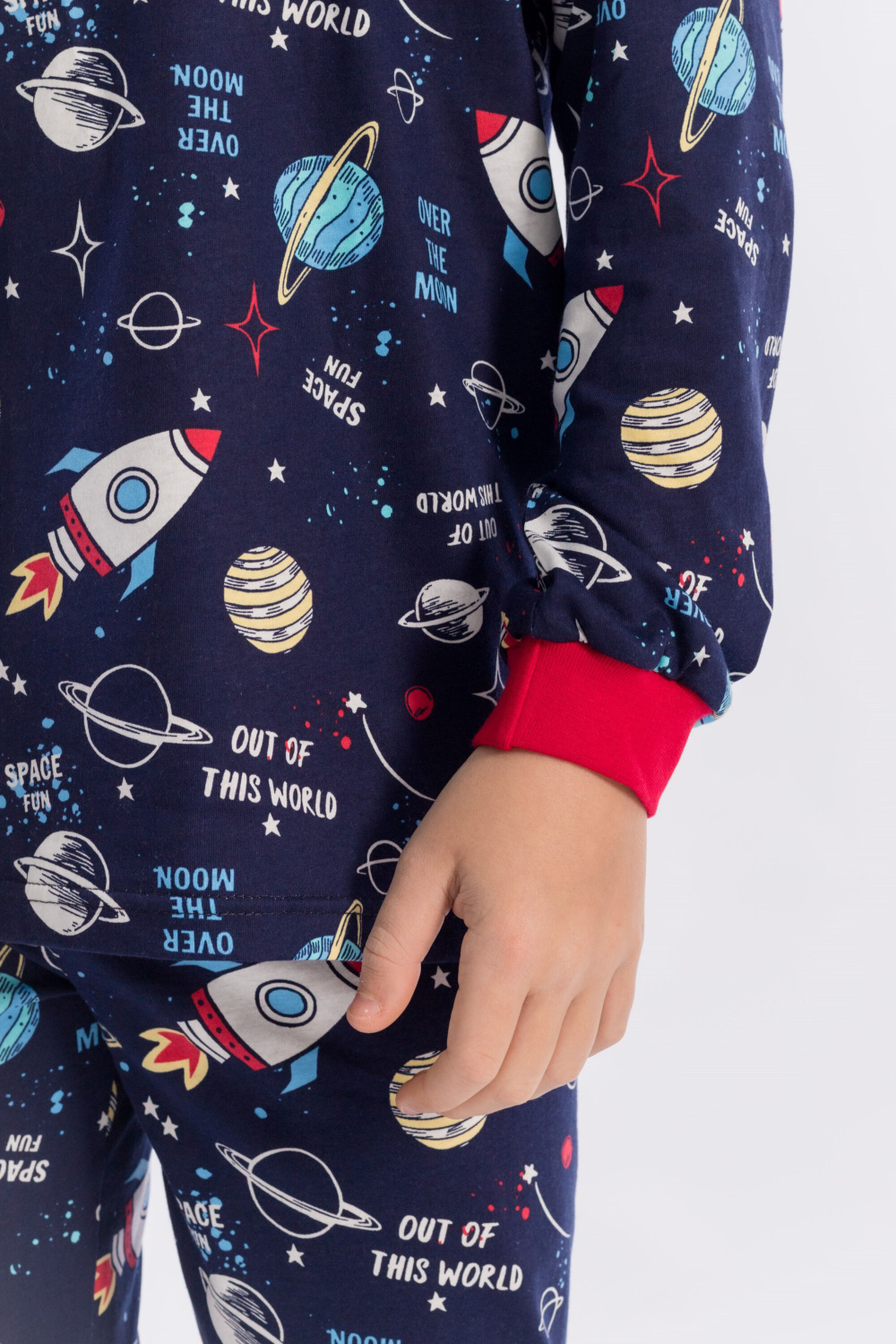 Пижама для мальчика, выполнена из хлопковой ткани с набивным рисунком. Футболка с длинным рукавом на манжете, брюки с поясом на резинке и манжетах снизу.