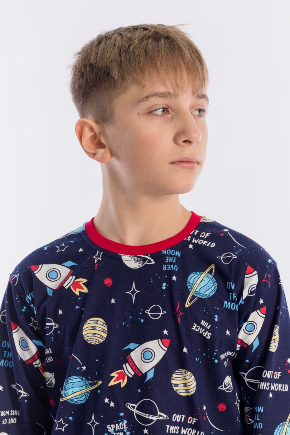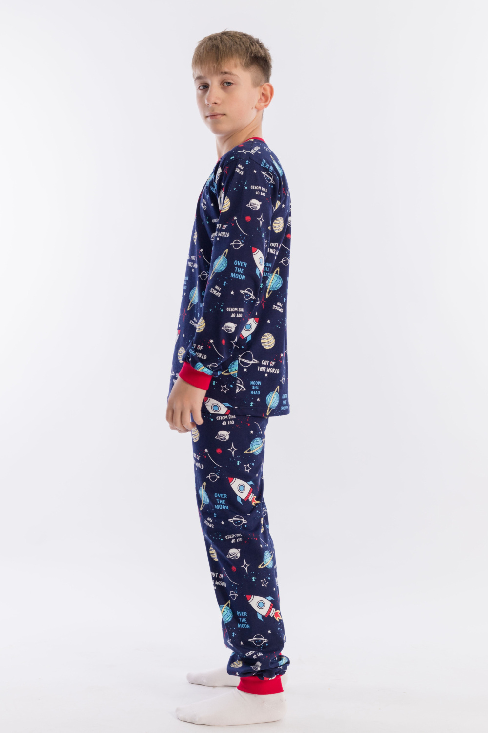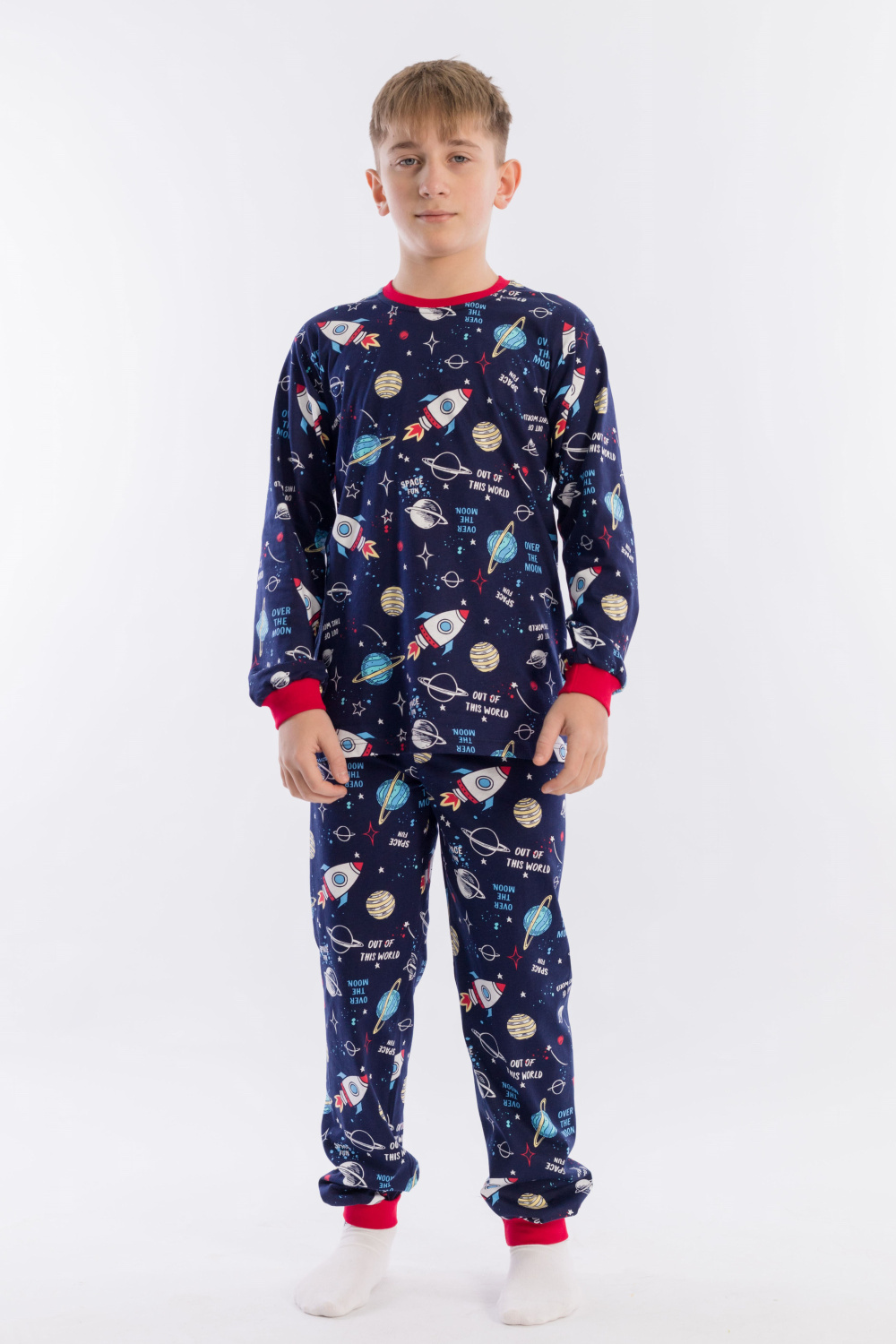 Пижама для мальчика, выполнена из хлопковой ткани с набивным рисунком. Футболка с длинным рукавом на манжете, брюки с поясом на резинке и манжетах снизу.