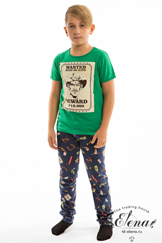 Пижама для мальчика, выполнена из хлопковой ткани с набивным рисунком. Футболка с длинным рукавом на манжете, брюки с поясом на резинке и манжетах снизу.