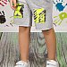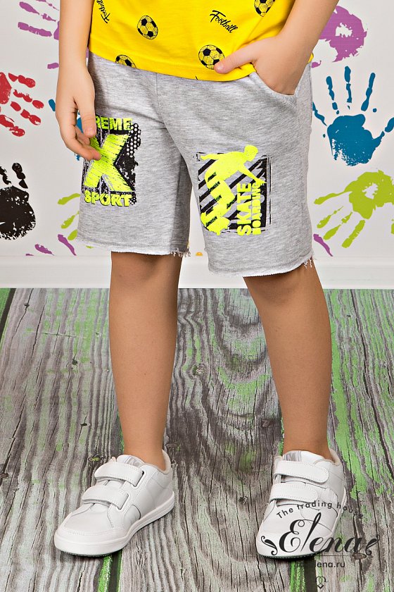 Шорты выполнены из футера-воздушки меланж. По бокам и сзади шорт размещены карманы. Пояс из кашкорсе, на резине, через люверсы проложен яркий шнур. Низ не обработан. Спереди нанесён принт.