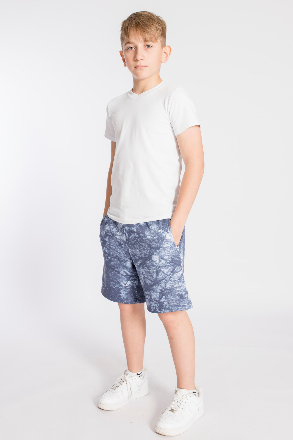 Детские шорты выполнены из футер петли. Пояс на резине, через петли продёрнут шнур. В шортах есть боковые карманы.