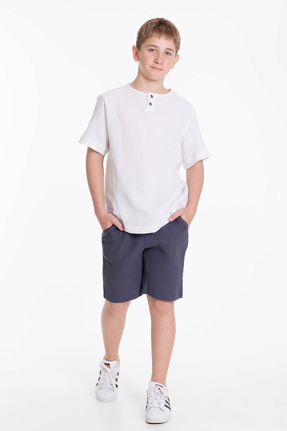 Шорты выполнены из однотонного муслина. По бокам размещены карманы, пояс с петлями и отделочным шнуром.