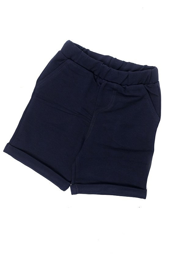 Детские шорты выполнены из футер петли с лайкрой. В поясе вставлена эластичная резина. Низ шорт оформлен отворотами. Спереди размещены два кармана.