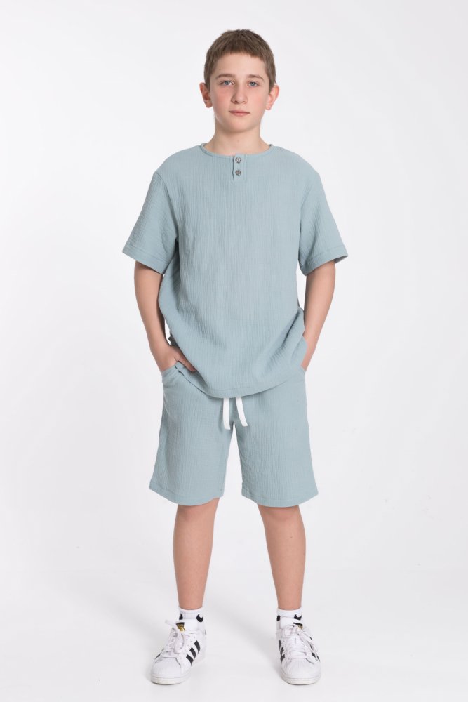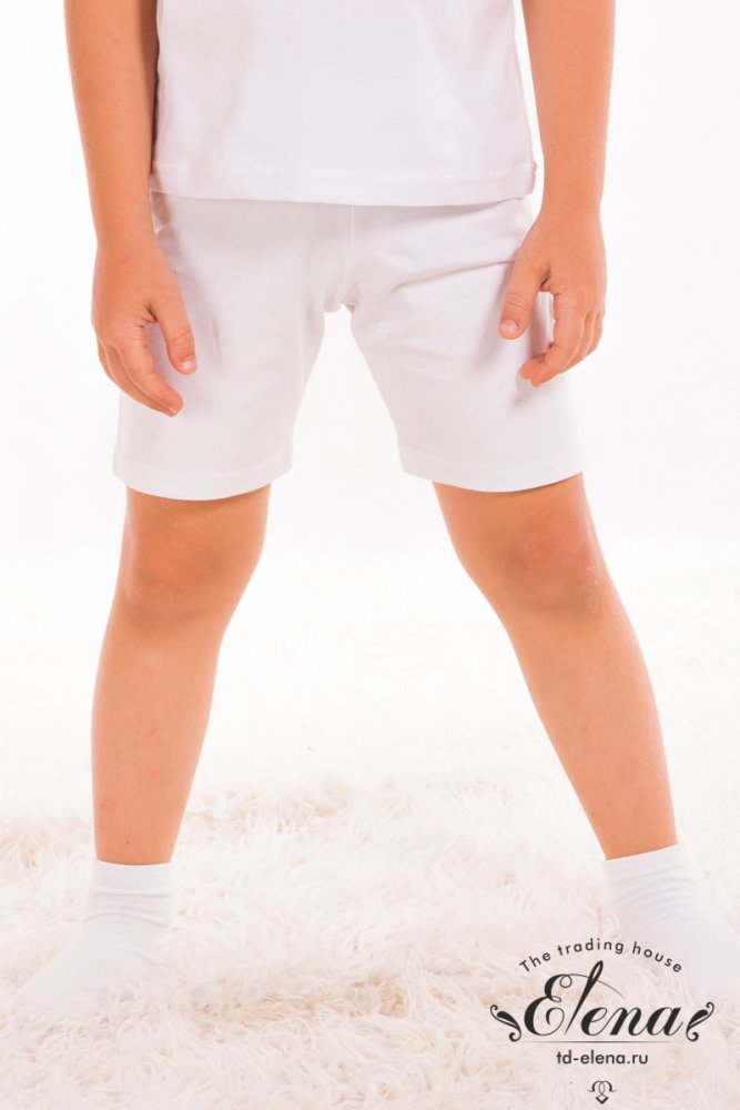 Шорты детские выполнены из футер петли. Пояс на резинке, через люверсы продёрнут шнур. По бокам расположены карманы. Спереди нанесён принт.