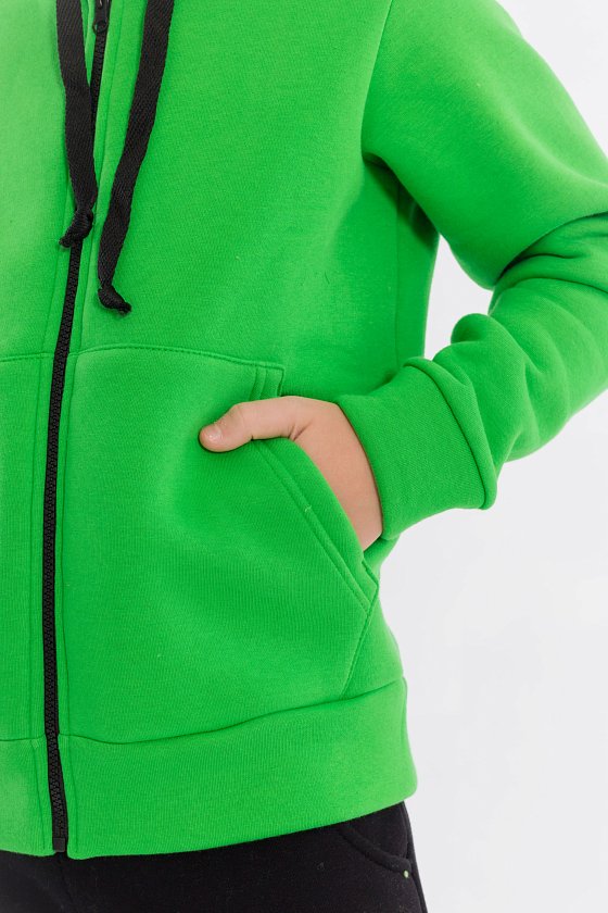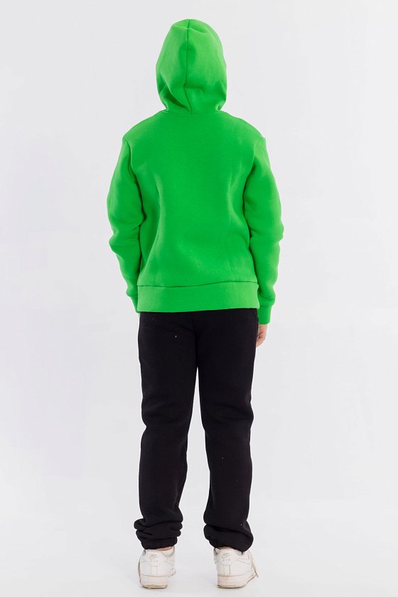 Толстовка выполнена из однотонного футера трёхнитки (начёс). Спереди с застёжкой на молнию и карманами. Ширина капюшона регулируется при помощи шнура, манжеты рукавов и пояс толстовки из основного полотна.