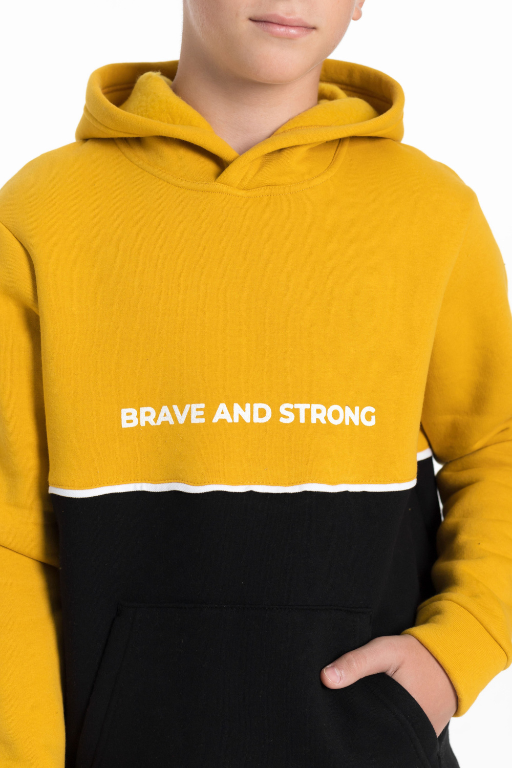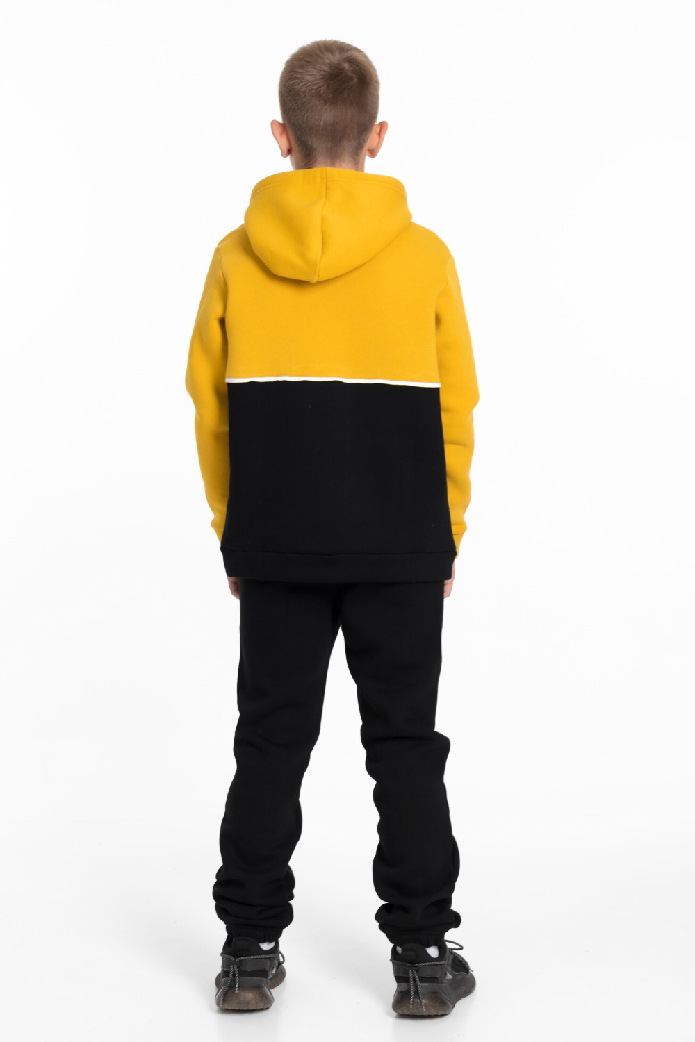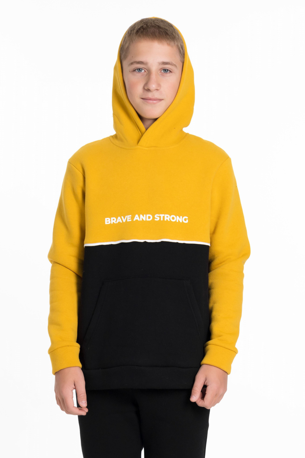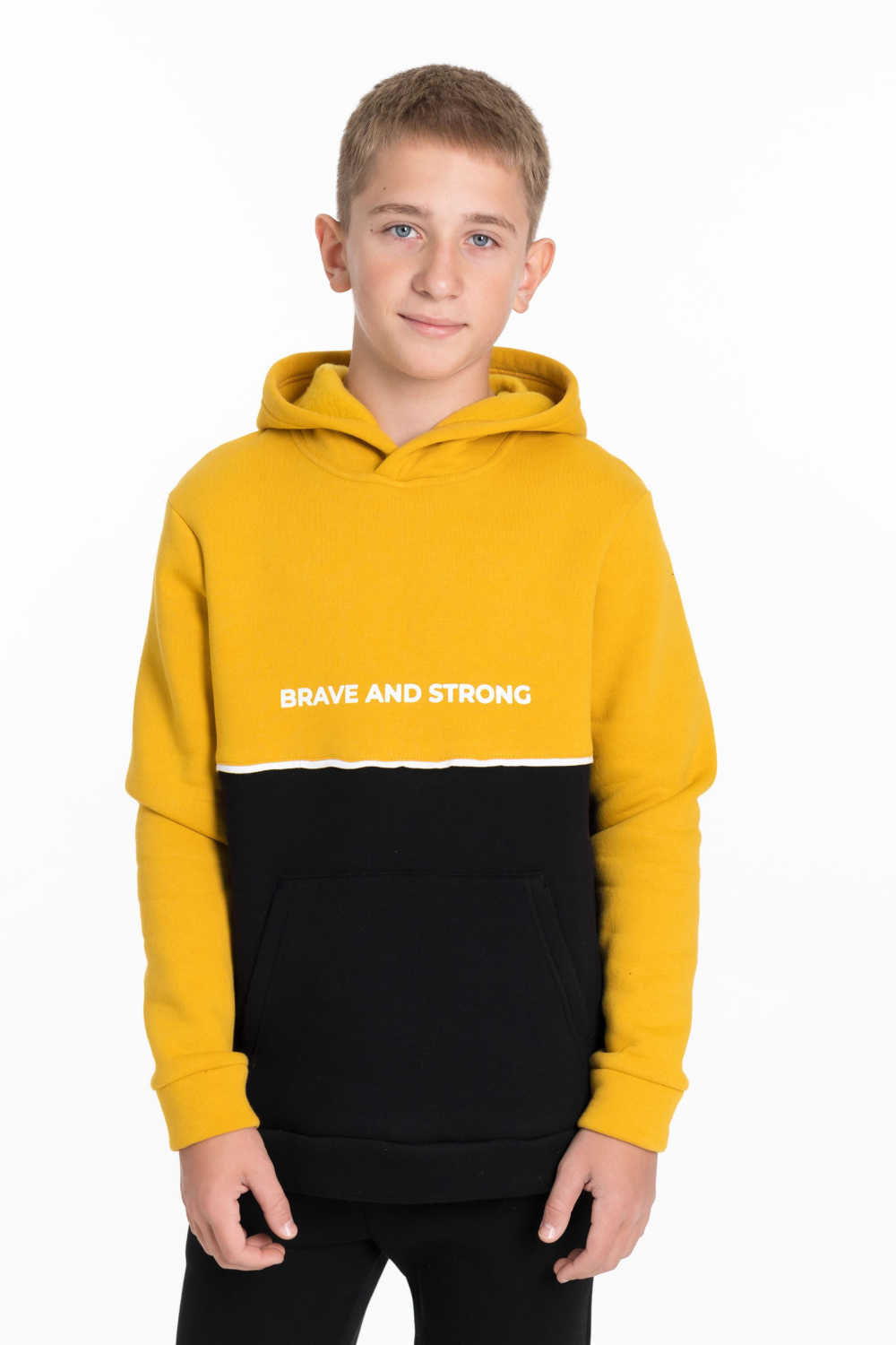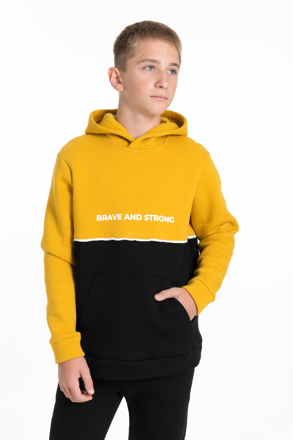 Толстовка для мальчика из футера 3-х нитки с начесом в двухцветном исполнении: горчичный и чёрный. Толстовка прямого кроя с длинным рукавом идеально подойдет для повседневной носки, добавит яркости и стиля в гардероб мальчика. Принт на верхней части полочки придаст дополнительный акцент и интересный вид. Капюшон поможет защитить голову от ветра и холода, а карман-кенгуру станет удобным местом для различных мелочей.