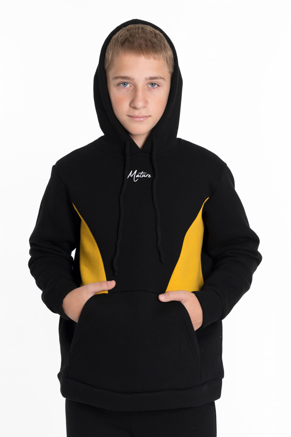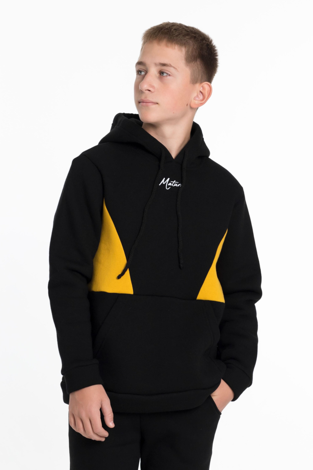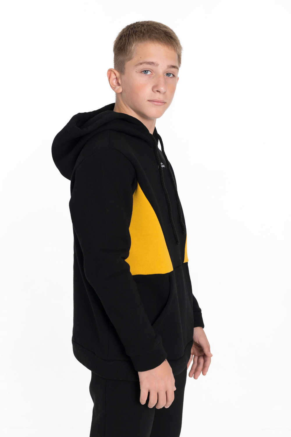 Толстовка для мальчика из черного футера 3-х нитки с начесом и отделкой горчичного цвета представляет собой стильную и удобную одежду. Прямого кроя, с длинным рукавом, капюшоном на шнуре и карманом-кенгуру, она идеально подходит для повседневного использования. Принт на полочке добавляет интересный акцент и делает толстовку более выразительной. Эта модель будет отличным выбором для активных и модных мальчишек.
