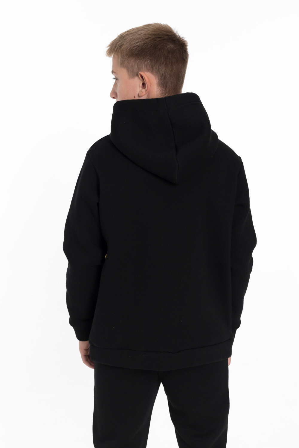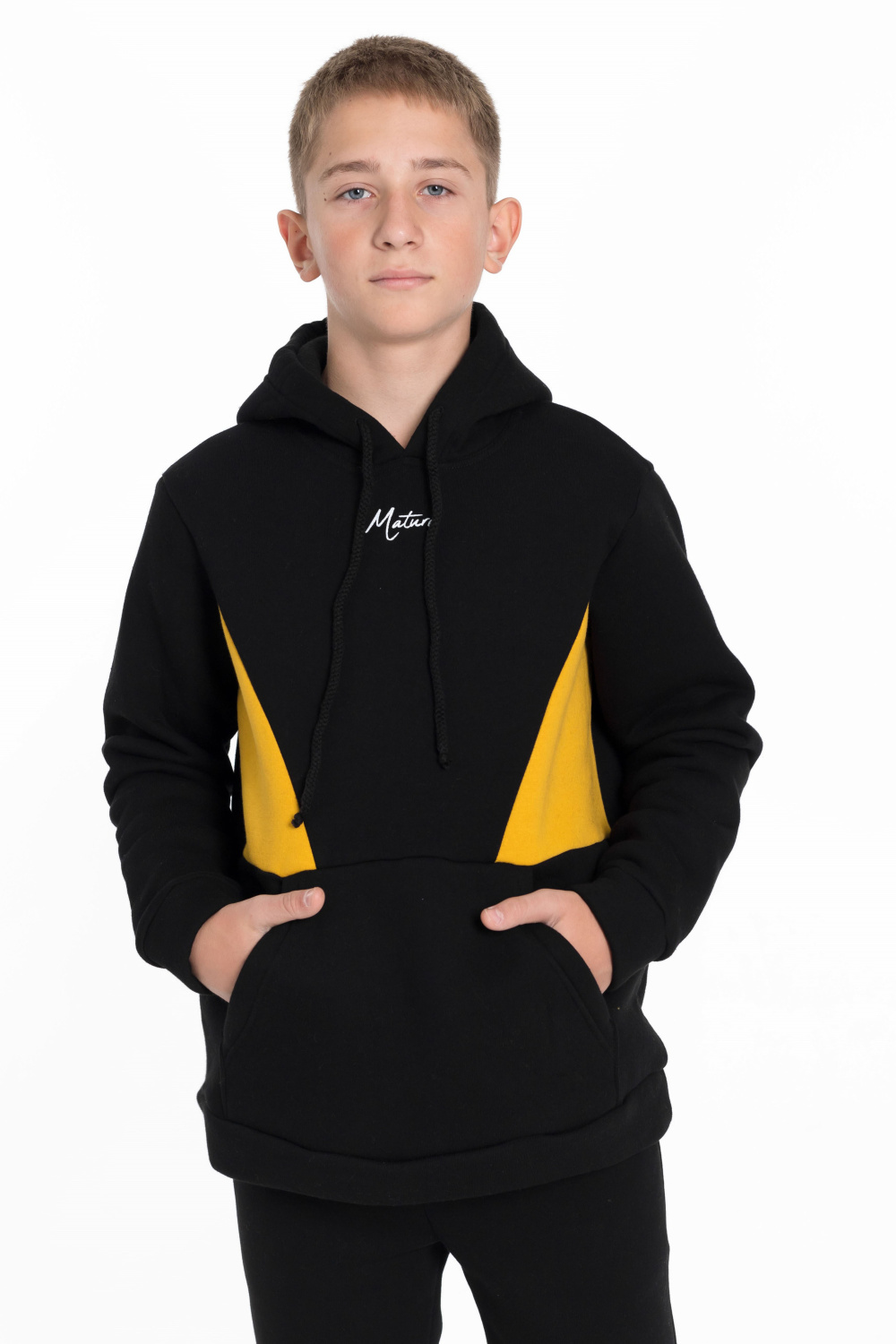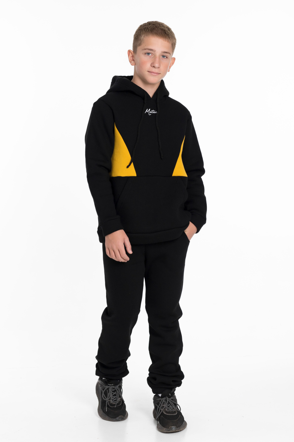 Толстовка для мальчика из черного футера 3-х нитки с начесом и отделкой горчичного цвета представляет собой стильную и удобную одежду. Прямого кроя, с длинным рукавом, капюшоном на шнуре и карманом-кенгуру, она идеально подходит для повседневного использования. Принт на полочке добавляет интересный акцент и делает толстовку более выразительной. Эта модель будет отличным выбором для активных и модных мальчишек.