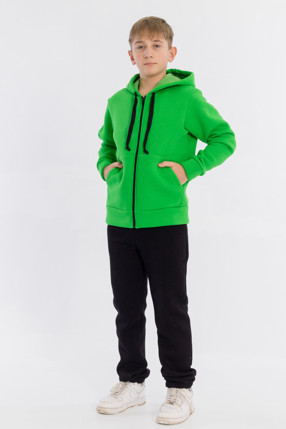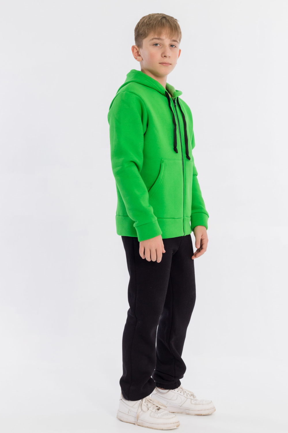 Толстовка выполнена из однотонного футера трёхнитки (начёс). Спереди с застёжкой на молнию и карманами. Ширина капюшона регулируется при помощи шнура, манжеты рукавов и пояс толстовки из основного полотна.