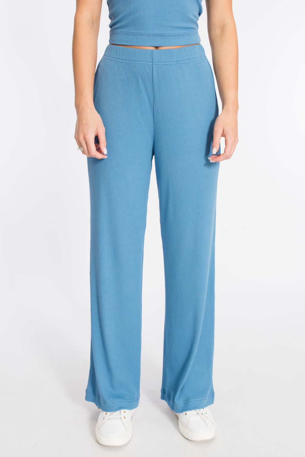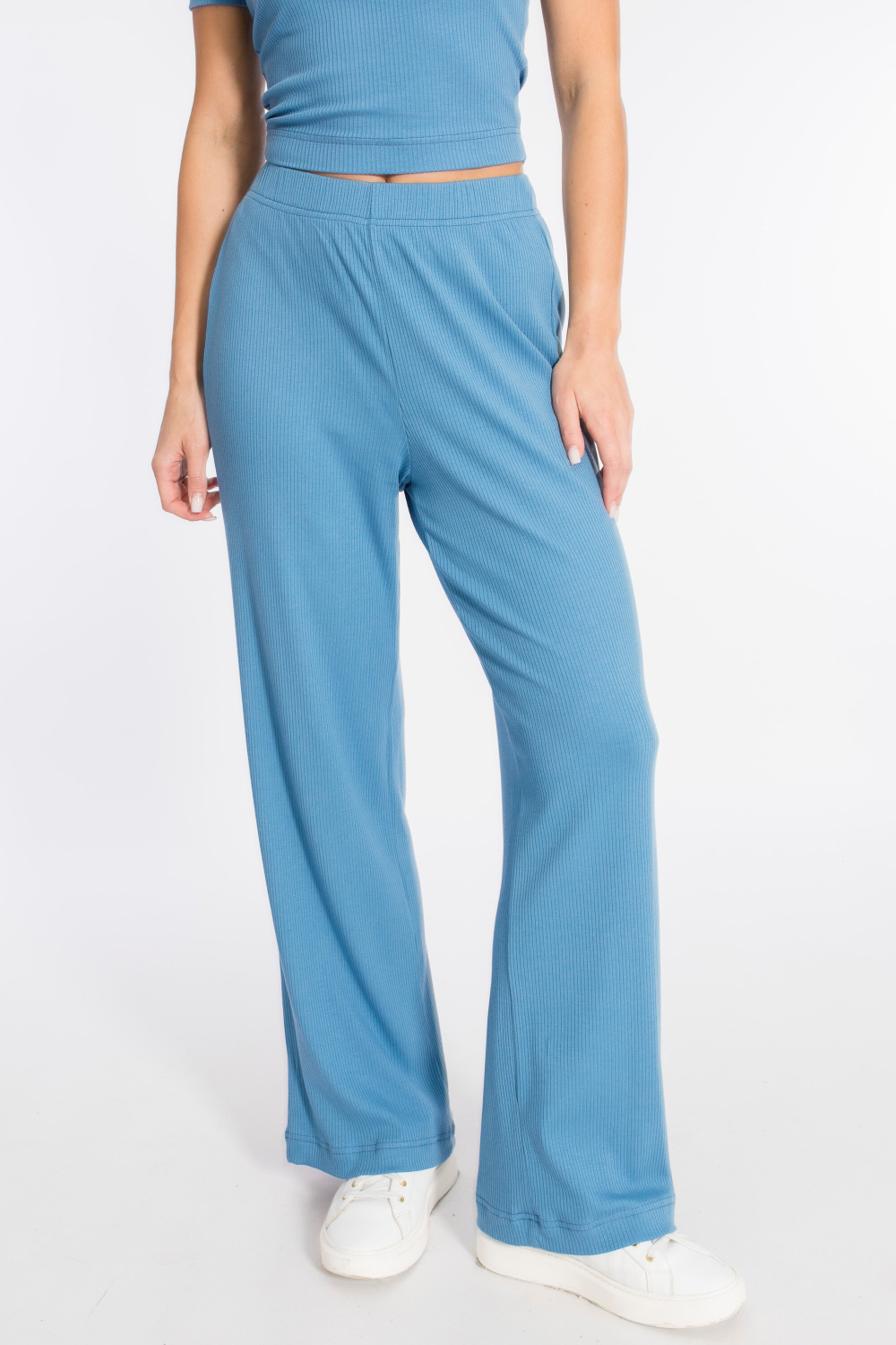 Женские брюки выполнены из однотонной кашкорсе-вискозы. Силуэт свободный, пояс на резинке.