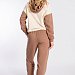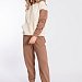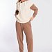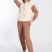 Брюки выполнены из однотонного футера трёхнитки (воздушка), с притачным поясом и резинкой по низу. По бокам размещены карманы.