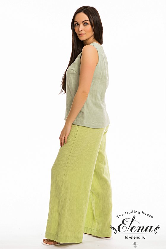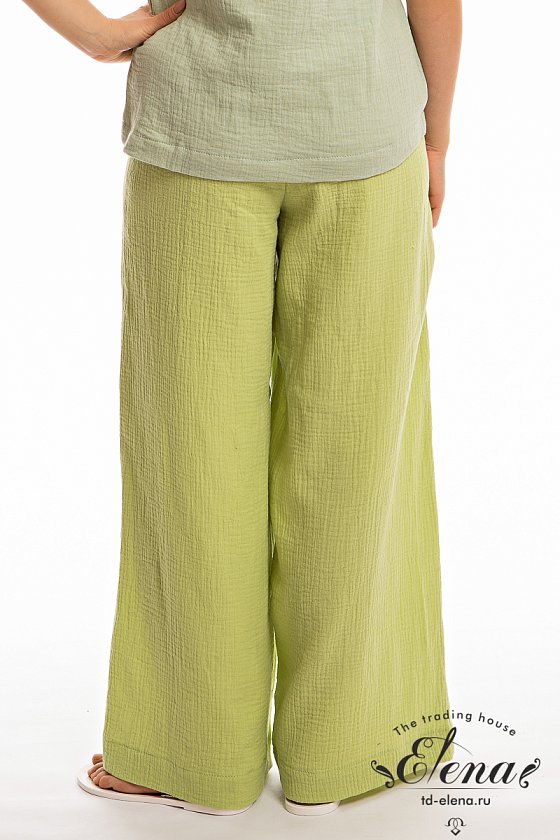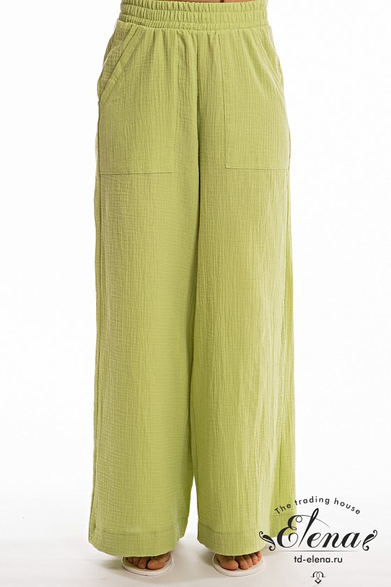 Женские брюки свободного силуэта из муслина. Спереди настрочены карманы, пояс на резине.