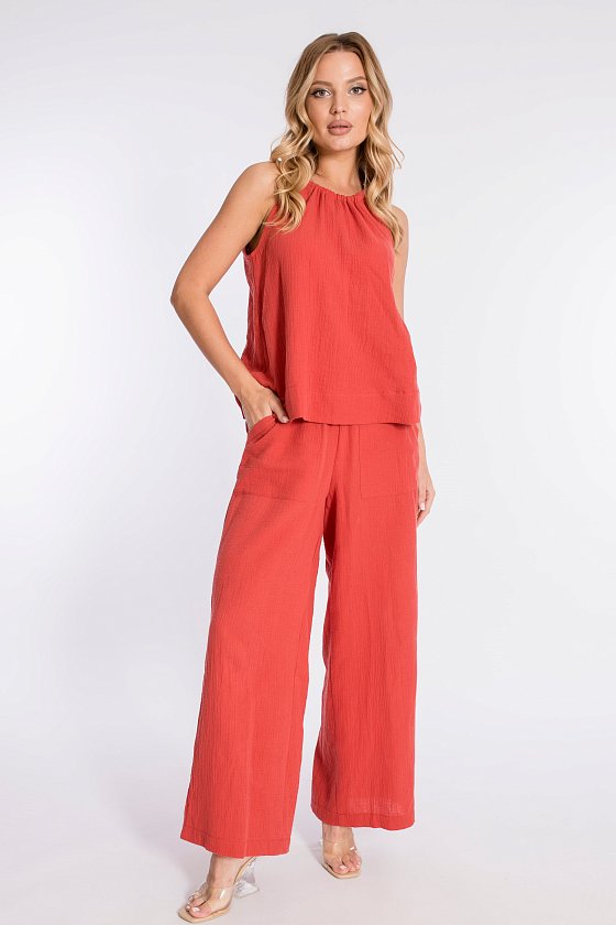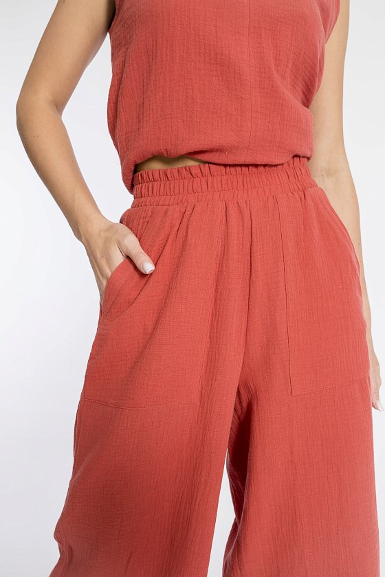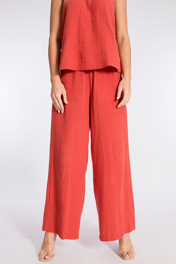 Женские брюки свободного силуэта из муслина. Спереди настрочены карманы, пояс на резине.