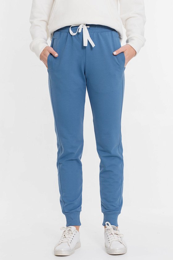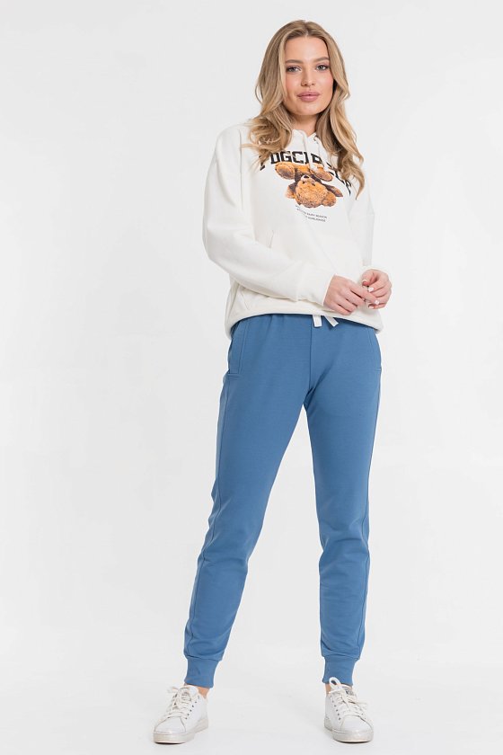 Брюки выполнены из однотонной футер петли с лайкрой. Для комфортной посадки в пояс брюк вставлены резина и шнур. По бокам размещены карманы. Низ брюк с манжетами из кашкорсе.