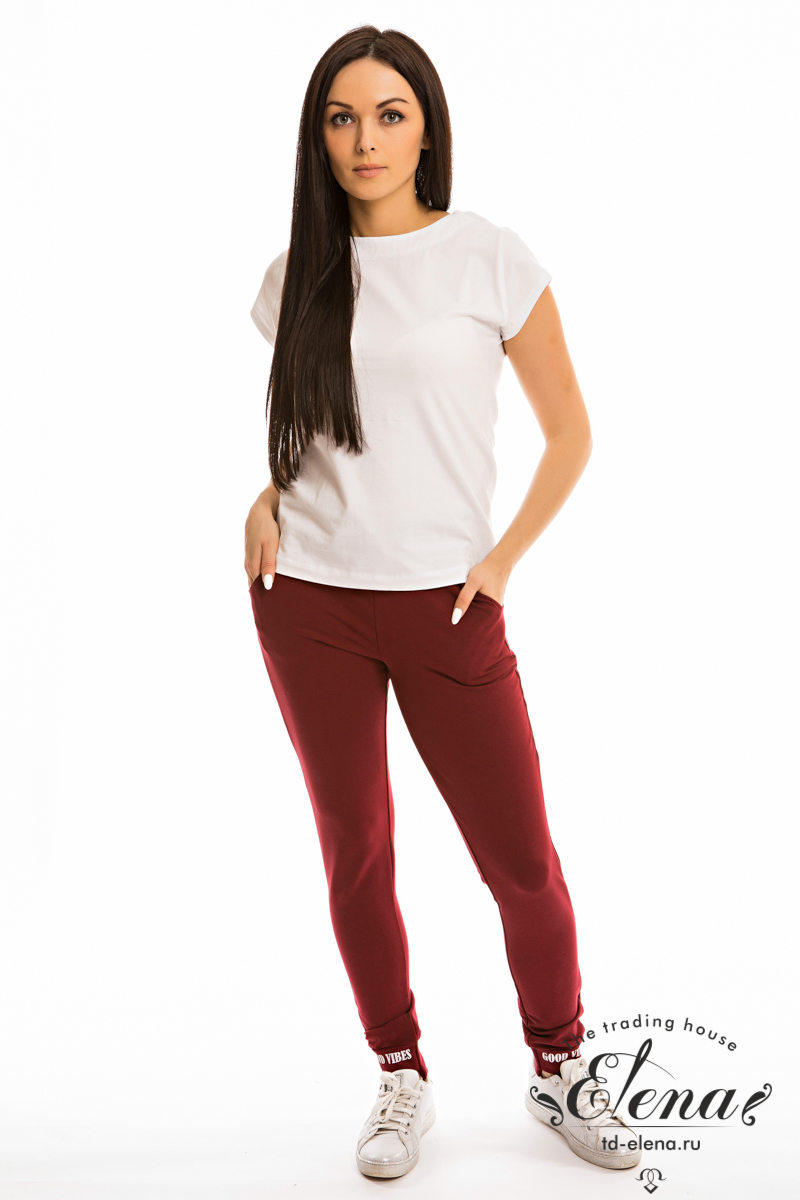 Спортивные брюки из футер петли с лайкрой. Зауженный покрой к низу, пояс на резинке, по бокам расположены карманы. Через петли в поясе проложен шнур. На передних частях манжет нанесён принт.