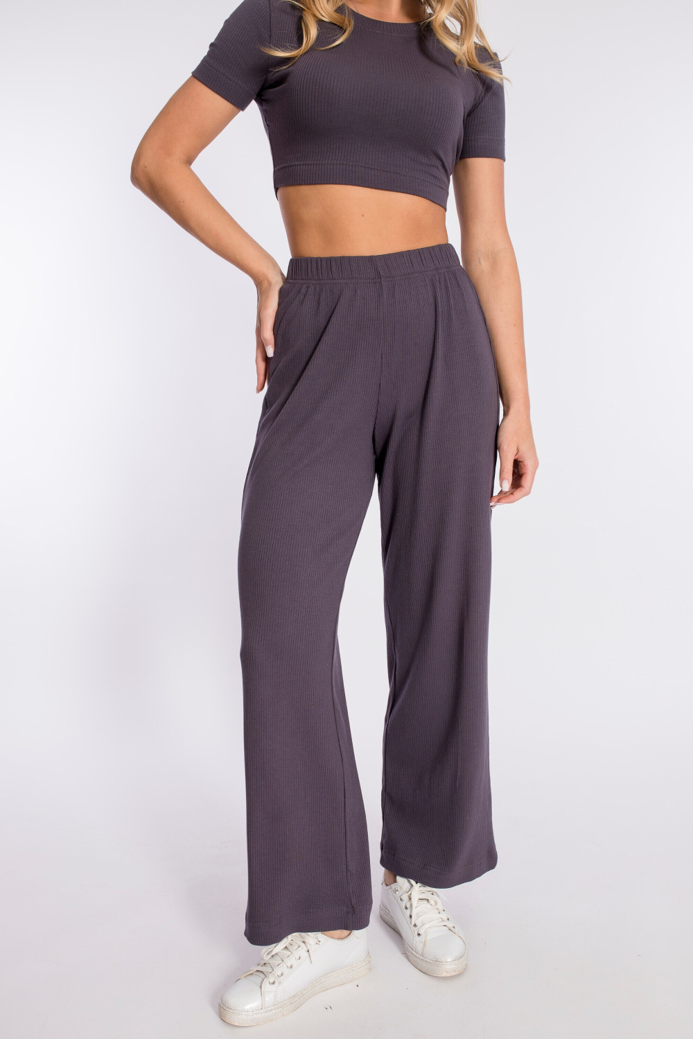 Женские брюки выполнены из однотонной кашкорсе-вискозы. Силуэт свободный, пояс на резинке.