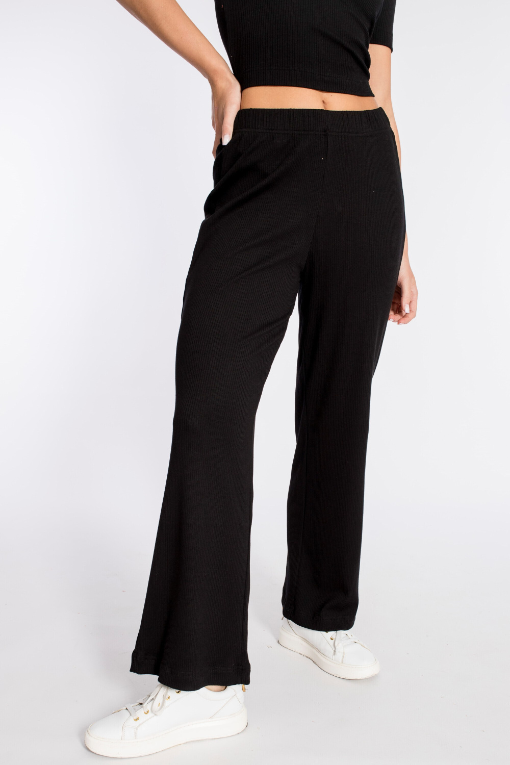 Женские брюки выполнены из однотонной кашкорсе-вискозы. Силуэт свободный, пояс на резинке.