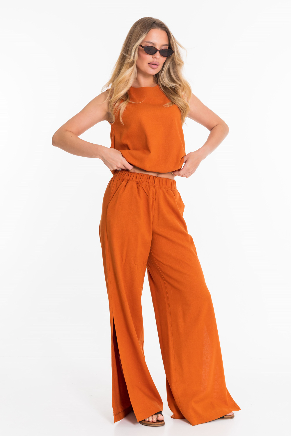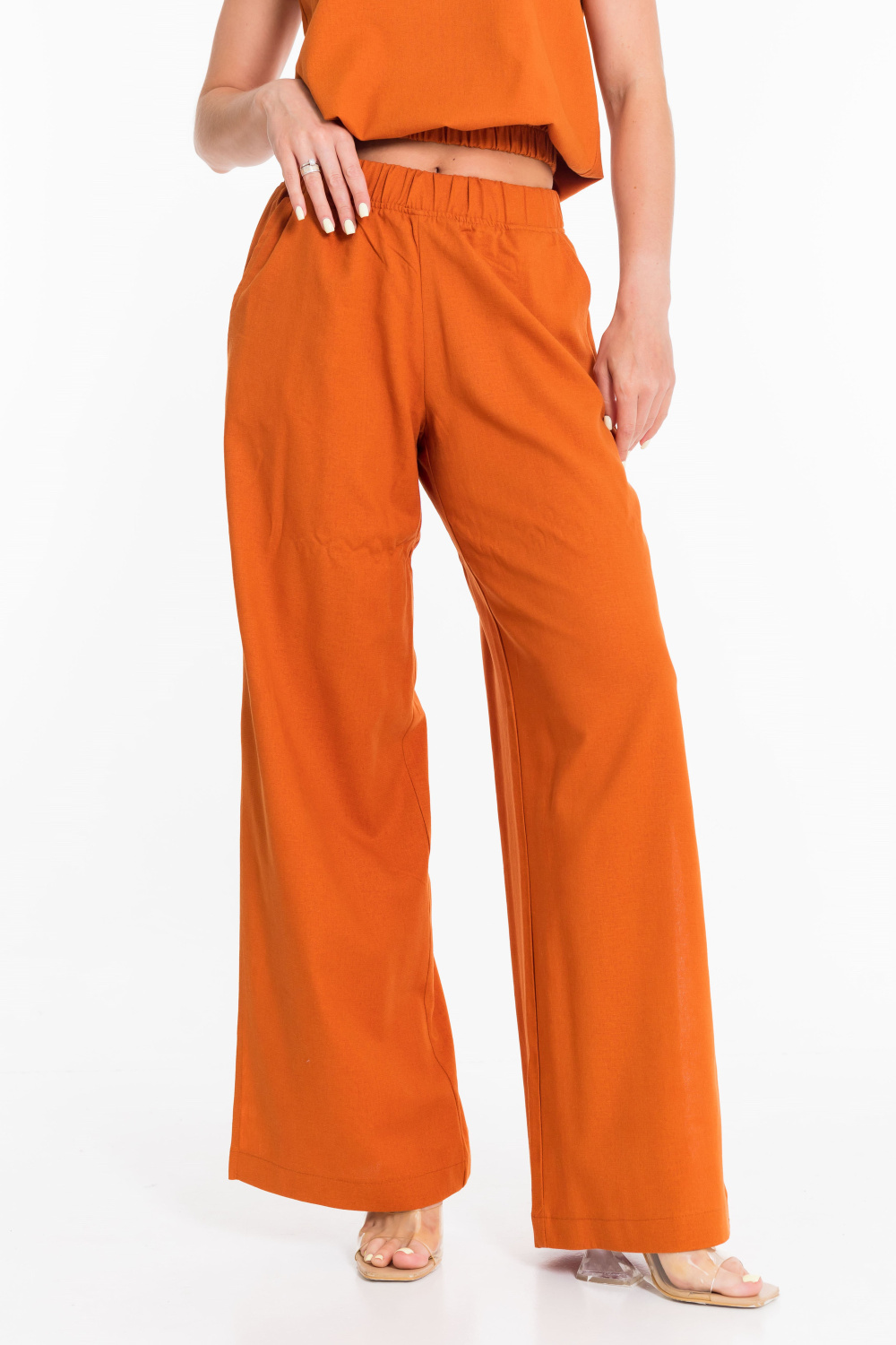 Брюки выполнены из натурального льна с добавлением вискозы. Брюки прямые с поясом на резине, карманами и большими разрезами по бокам.