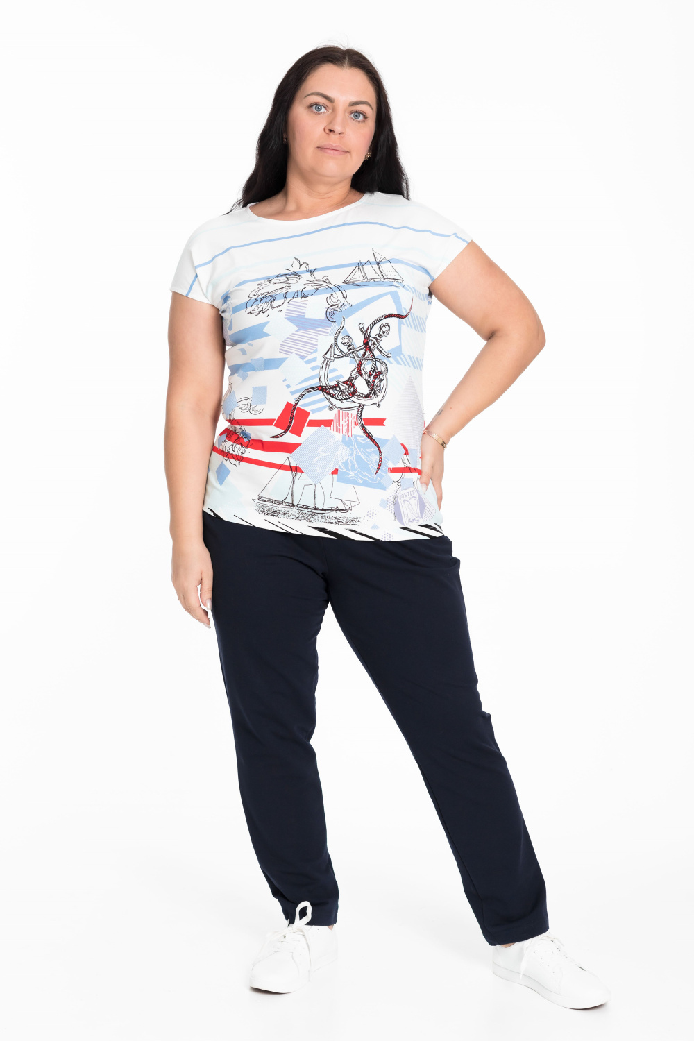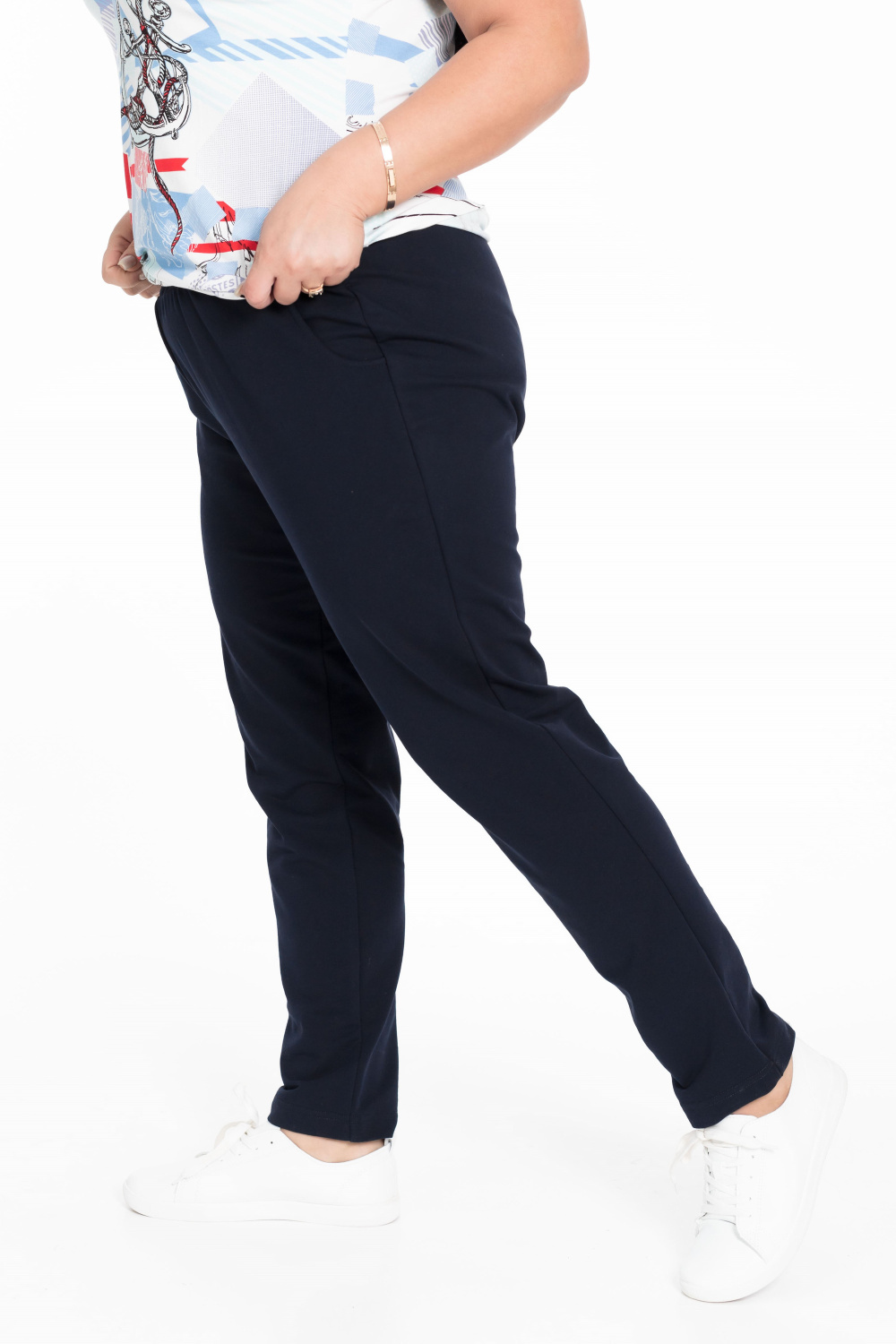 Брюки прямого кроя с притачным поясом на резинке и боковыми карманами обеспечивают удобство и практичность.