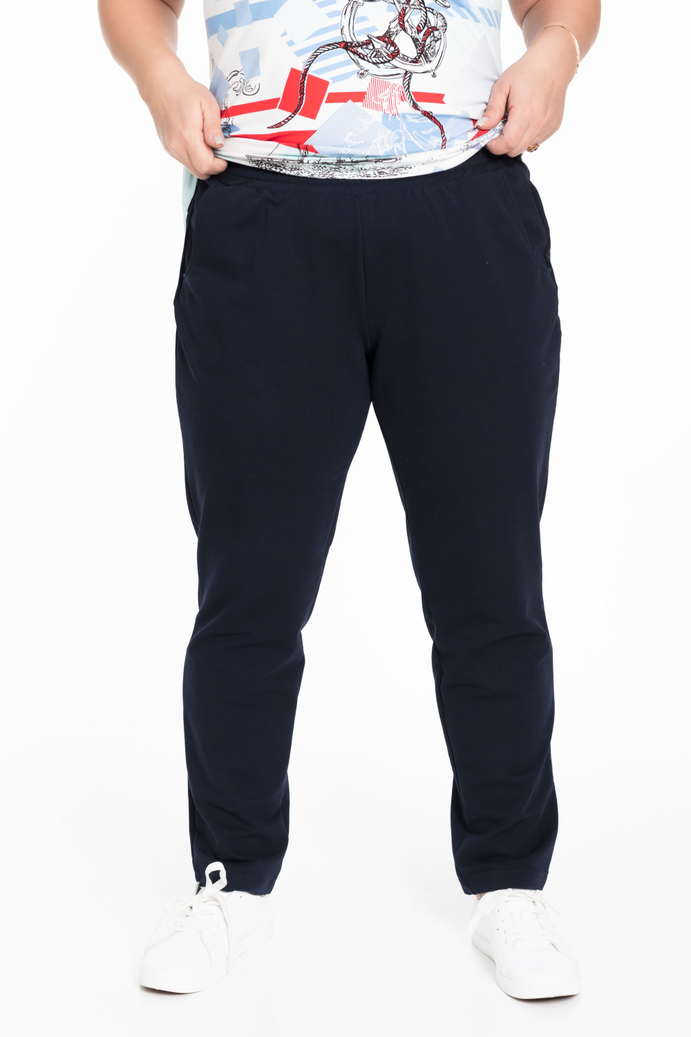 Женские брюки выполнены из футера петли синего цвета.