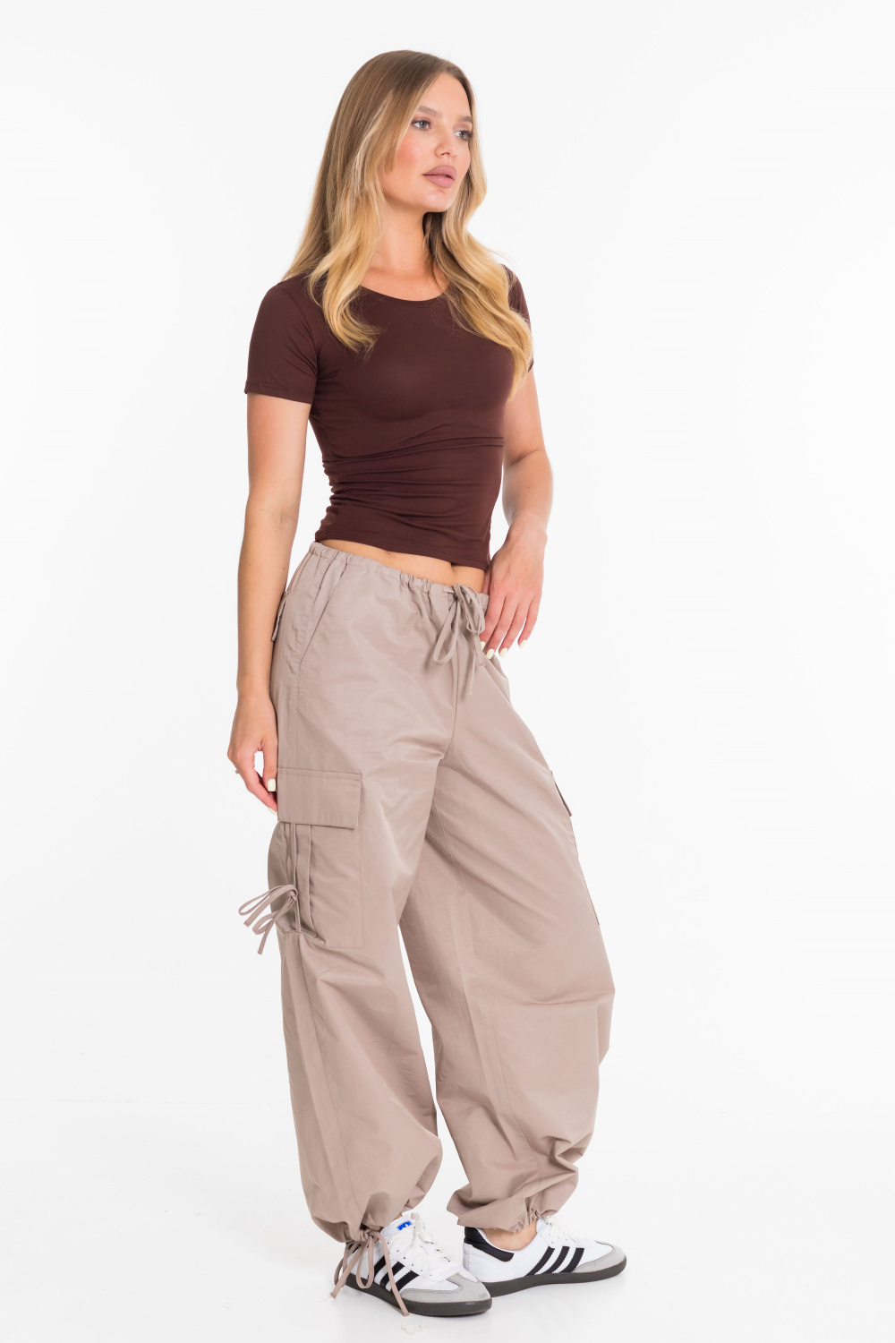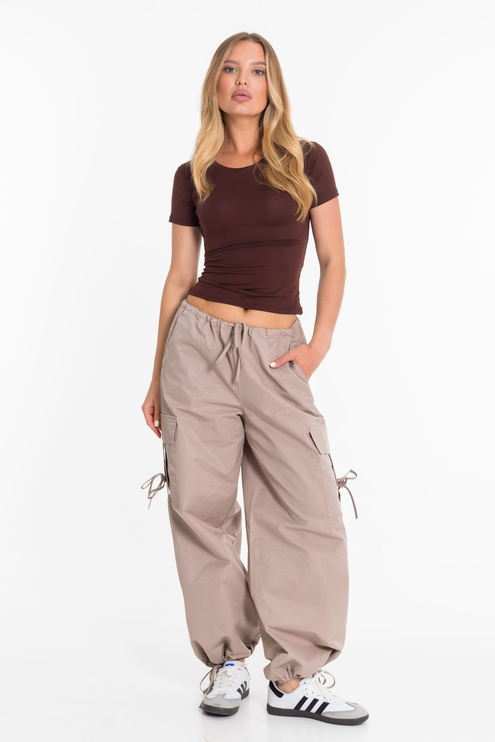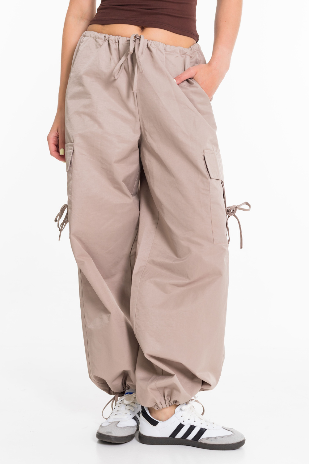 Женские брюки-карго из плащевой ткани сочетают в себе практичность и современный стиль. Модель свободного кроя с регулируемым поясом на шнуре обеспечивает удобную посадку и не сковывает движений. Прочное и легкое плащевое полотно дарит комфорт в течение всего дня, а функциональный дизайн с множеством карманов и стильными затяжками позволяет легко сочетать брюки как с объемными худи и кроссовками, так и с облегающими топами и кедами. Отличный вариант для повседневных уличных образов.