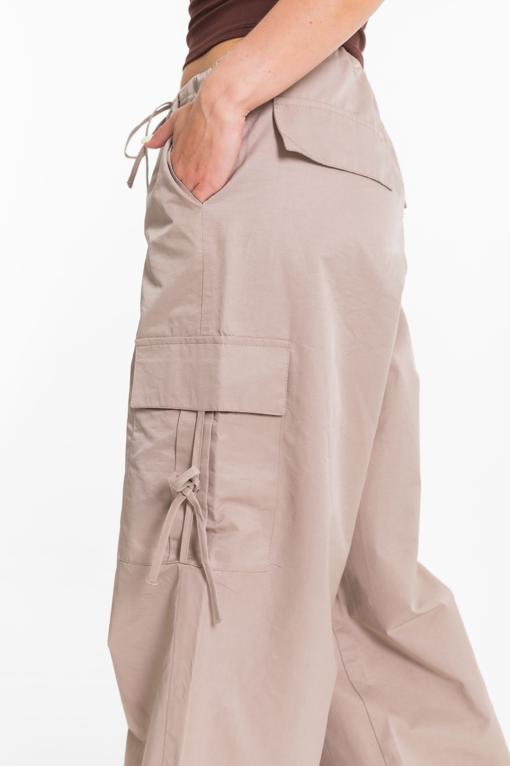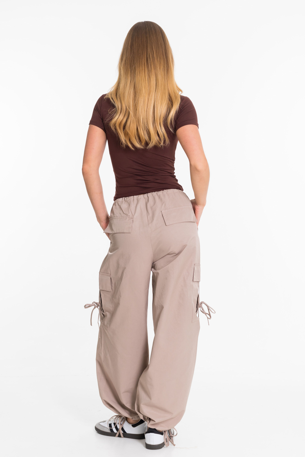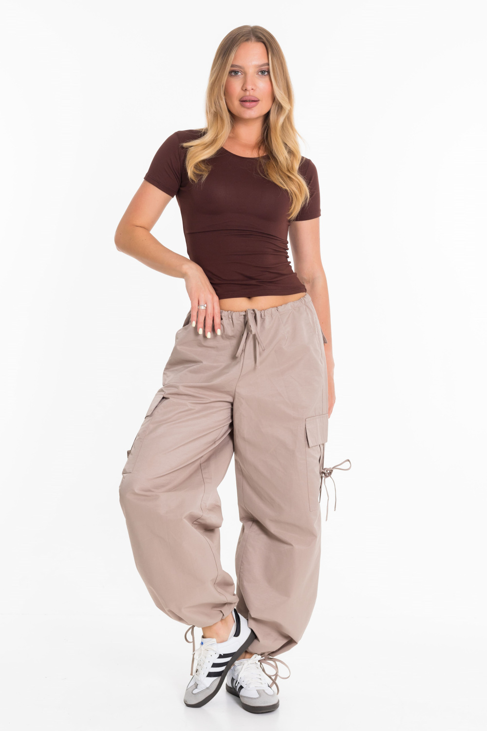 Женские брюки-карго из плащевой ткани сочетают в себе практичность и современный стиль. Модель свободного кроя с регулируемым поясом на шнуре обеспечивает удобную посадку и не сковывает движений. Прочное и легкое плащевое полотно дарит комфорт в течение всего дня, а функциональный дизайн с множеством карманов и стильными затяжками позволяет легко сочетать брюки как с объемными худи и кроссовками, так и с облегающими топами и кедами. Отличный вариант для повседневных уличных образов.