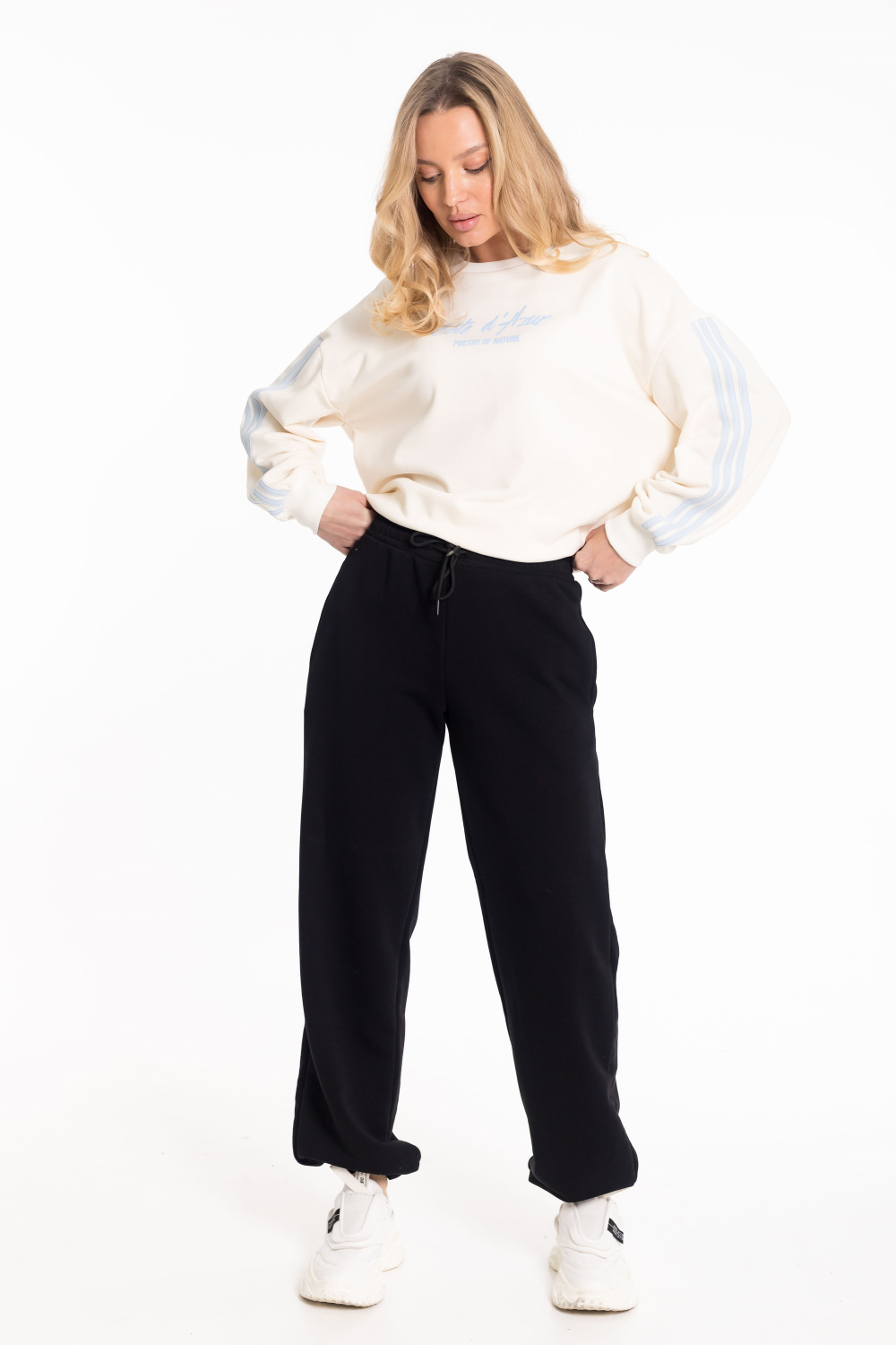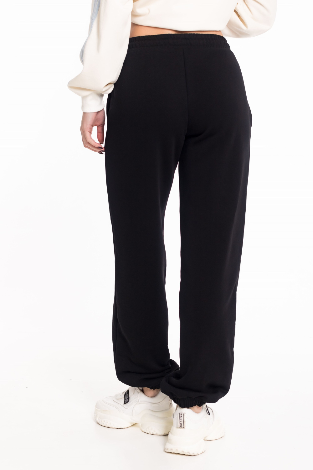 Женские брюки из однотонного футера «воздушка» — удобная и стильная основа для повседневных образов. Модель выполнена с притачным поясом, в который вставлена резинка, и оснащена шнуром, продетым через петли для дополнительной регулировки посадки. В боковых швах расположены функциональные карманы, а низ брюк собран на резинку, что придаёт образу аккуратный и современный вид.