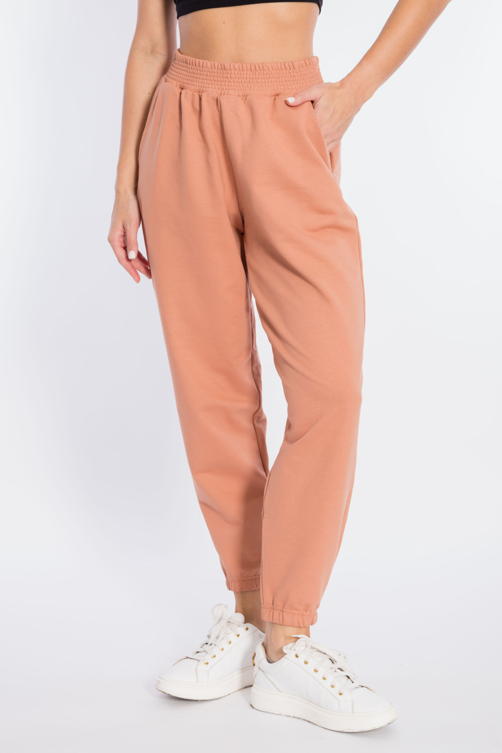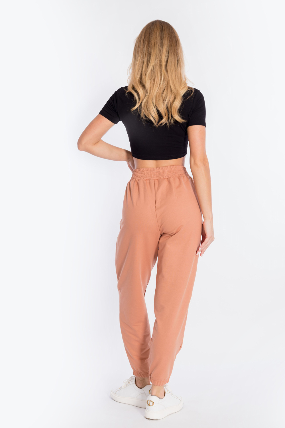 Брюки выполнены из однотонного футера с лайкрой, с притачным поясом и резинкой по низу. По бокам размещены карманы.