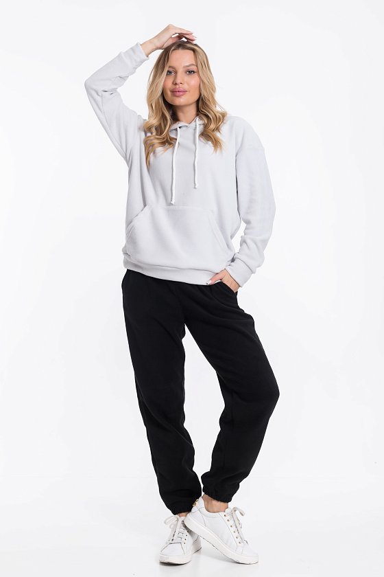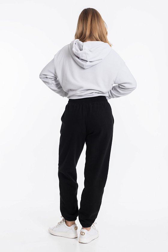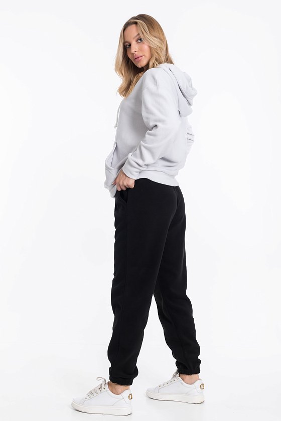 Женские чёрные брюки из флиса — отличный выбор для повседневной носки. Боковые карманы и пояс на резинке со шнуром обеспечивают комфортную посадку, а низ штанин на резинке хорошо садится по фигуре. Брюки сохраняют тепло и подходят для активного отдыха.