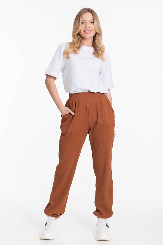 Брюки женские из полотна Вафля - 100% хлопок, легкие, воздушные и комфортные. Расположенные по бокам карманы делают их практичными и удобными для хранения мелочей. Пояс и низ брюк на резинке обеспечат хорошую посадку и комфорт при ношении.