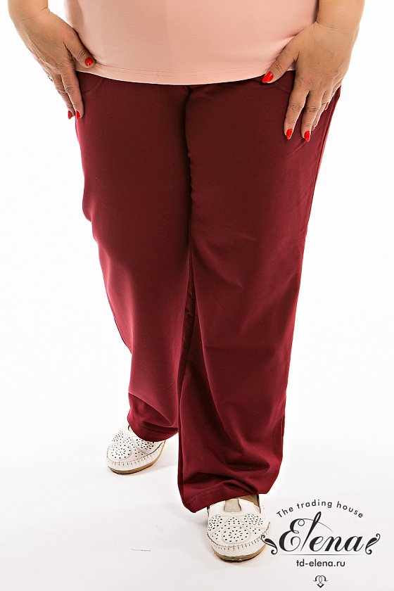 Брюки женские выполнены из однотонной футер петли с лайкрой, спереди расположены два кармана, пояс на резинке.