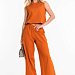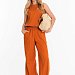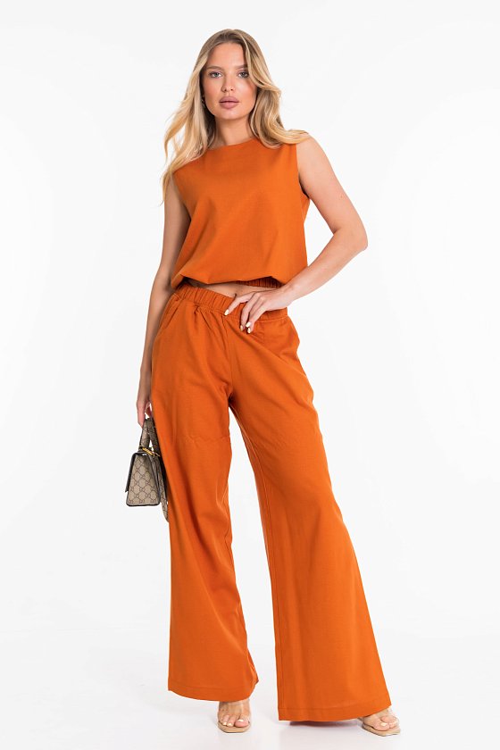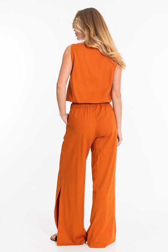 Брюки выполнены из натурального льна с добавлением вискозы. Брюки прямые с поясом на резине, карманами и большими разрезами по бокам.