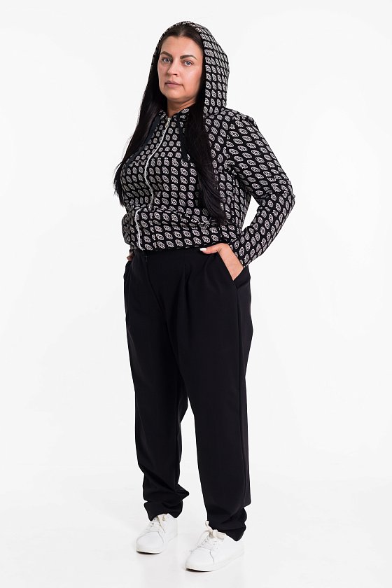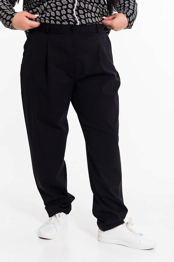 Женские брюки выполнены из однотонного академика. Брюки заужены к низу, по бокам размещены карманы. Спереди застроченная складка-защип, застежка на молнию и пуговицу. Пояс притачной со шлевками, с резинкой сзади.