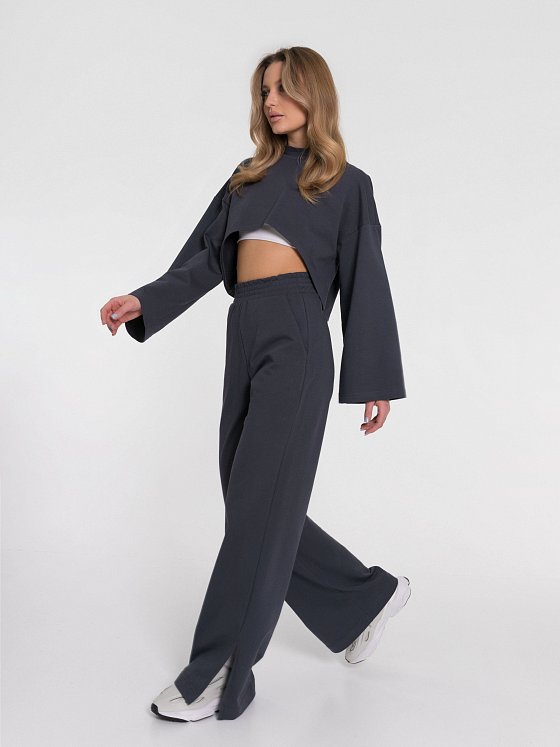 Брюки из мягкого футера с комфортной высокой посадкой. Модель дополнена функциональными карманами и разрезами внизу штанин, которые придают образу современный акцент. Отличный выбор для повседневного стиля, сочетающий удобство и лаконичный дизайн.