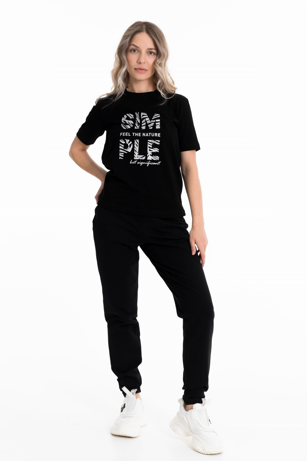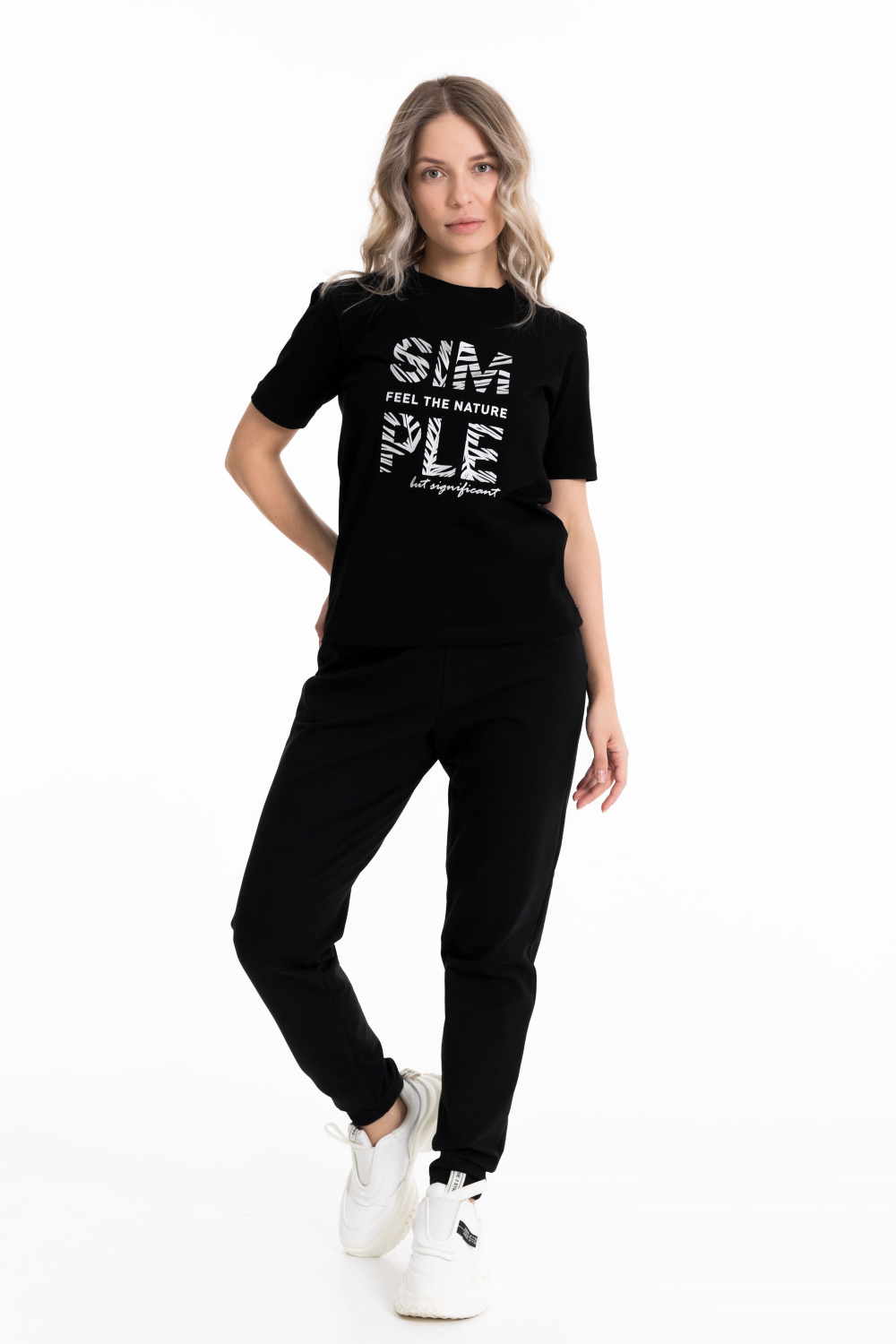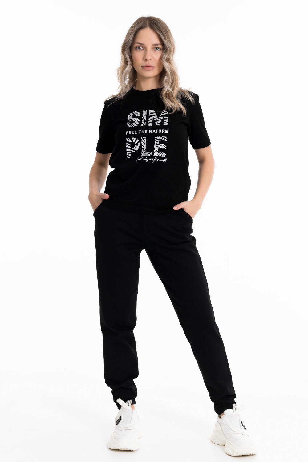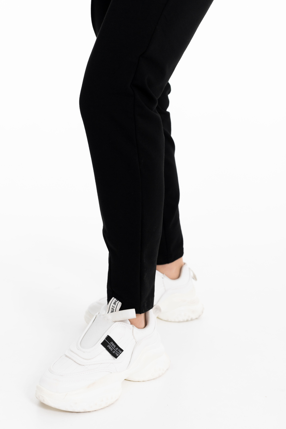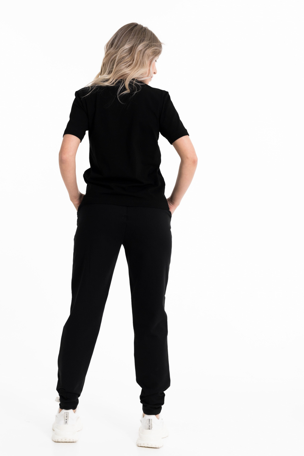 Брюки женские выполнены из футера с лайкрой черного цвета. С боковыми карманами и поясом на резине. Силуэт брюк заужен внизу, сзади и спереди прошиты вытачки как декоративный элемент.